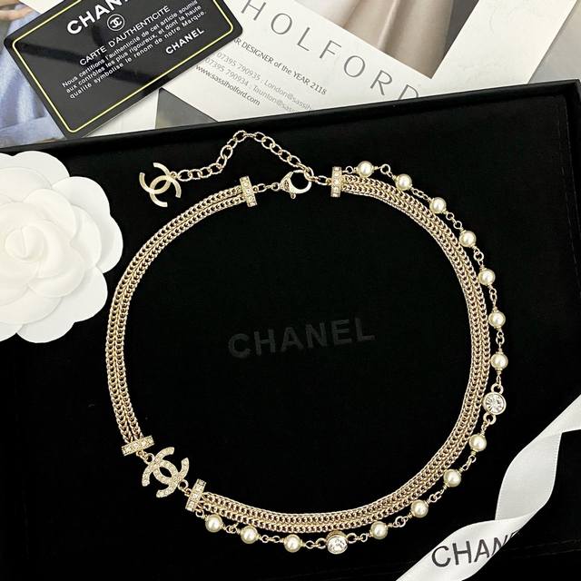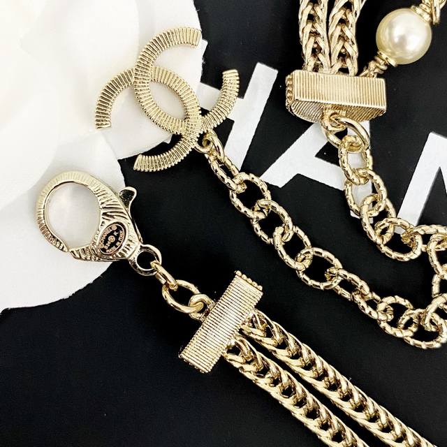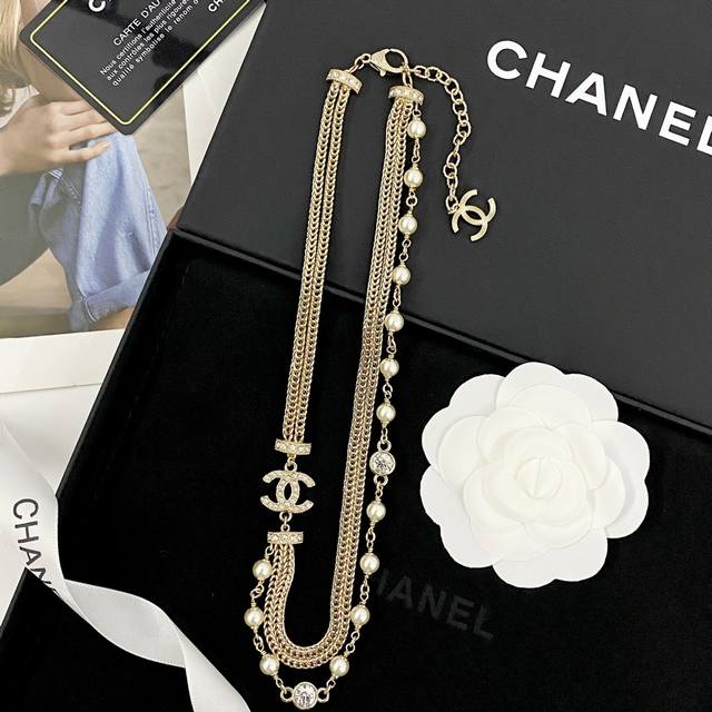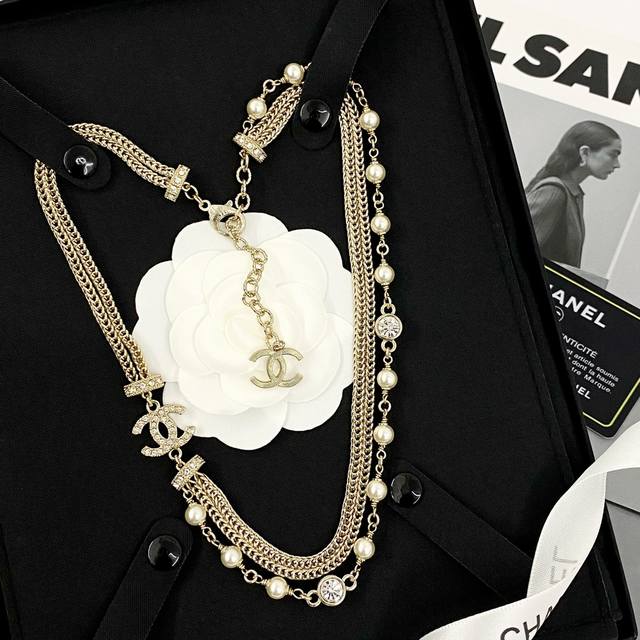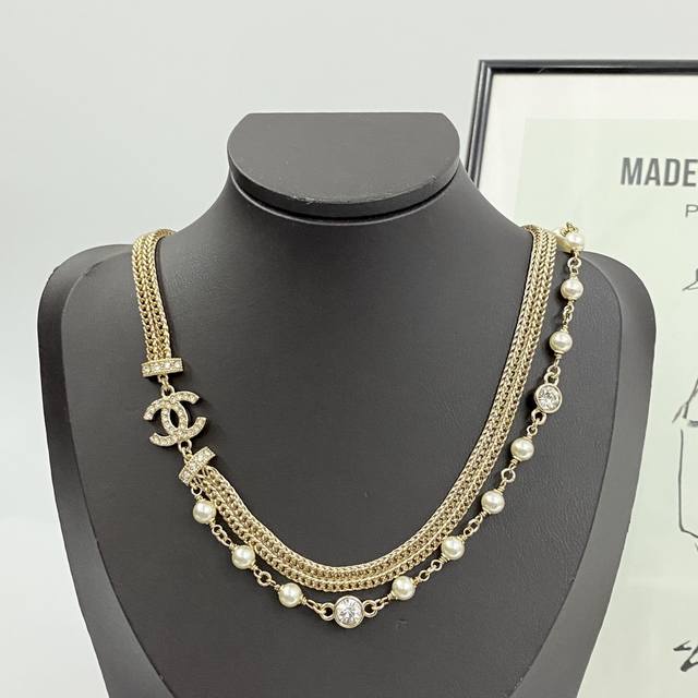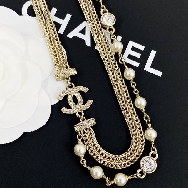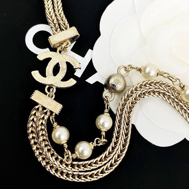 Chanel necklaces are hot sellers! The Chan 24 diamond-studded double C metal braided chain and pearl multilayer necklace features a braided pattern, double pearl and rhinestone chains, and a triple-chain design for a layered look. This sweet, sophisticated, and aesthetically pleasing necklace is sure to turn heads whether worn daily or at parties.