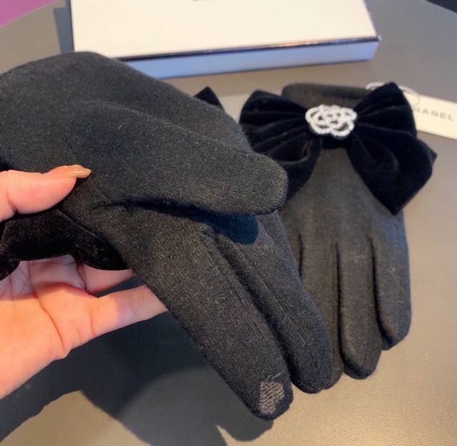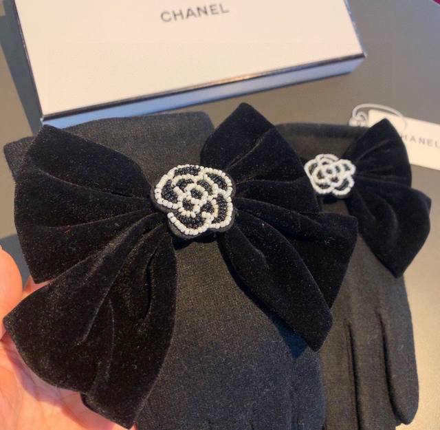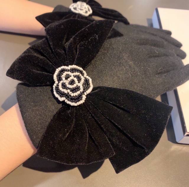Chanel new arrival wool gloves from the boutique. Stylish gloves with beaded camellia design and a large bow. Warm and fleece-lined for autumn and winter. Super cute bow, incredibly comfortable and soft to wear, versatile! One size fits all.