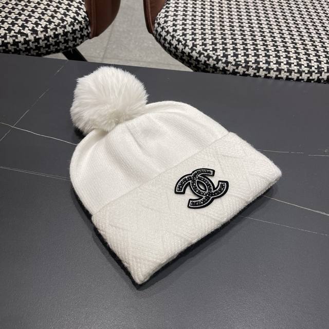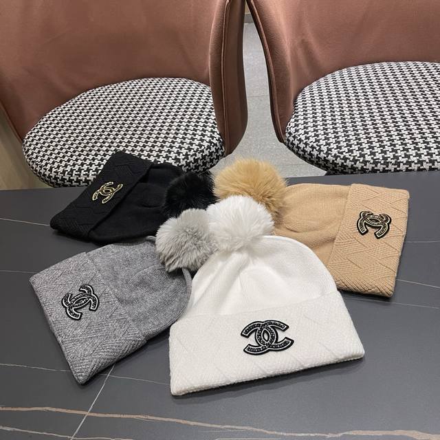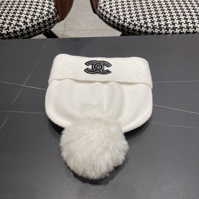 Chanel New Autumn/Winter Hat for Women, Fashionable and Versatile Knitted Beanie with Pom-poms, Solid Color, Warm, Earflap Hat DDD