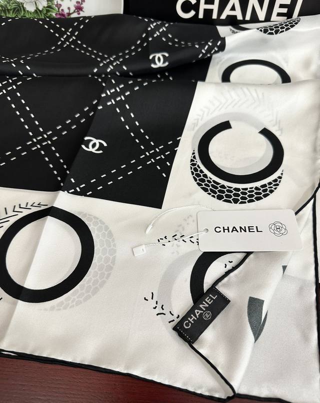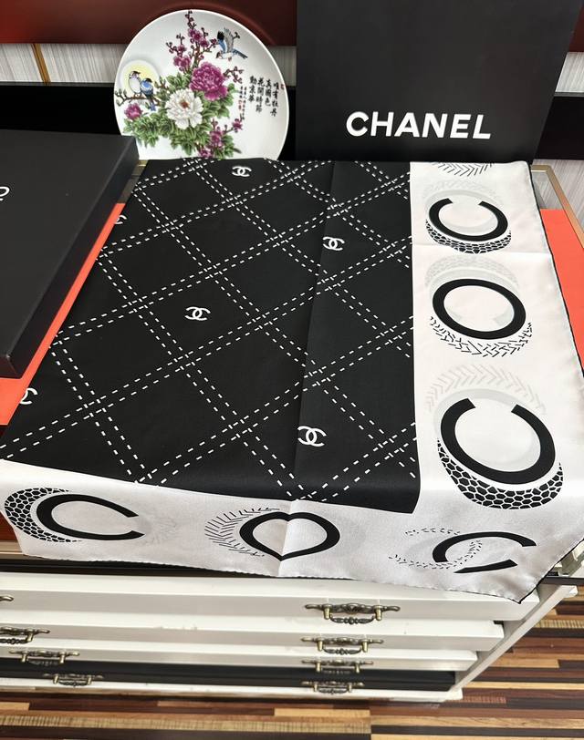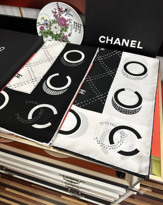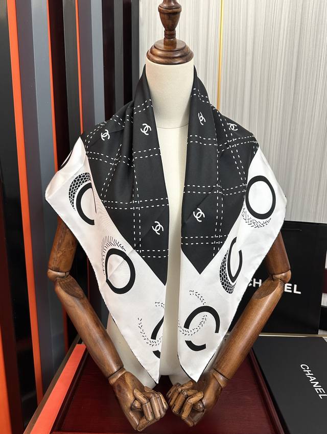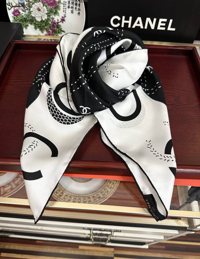 Chanel official website synchronized with exquisite hand-rolled edges, featuring the brand's signature graffiti jacquard pattern, simple Coco logo print, and large diamond quilting [lips]. The retro and sophisticated color scheme is the perfect finishing touch, showcasing elegance. No matter what colors are trending, classic black and white always stay on top of fashion and look great with anything. Size: 90X90, Material: Silk, 2 colors available.