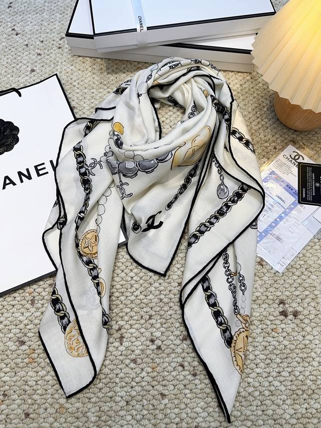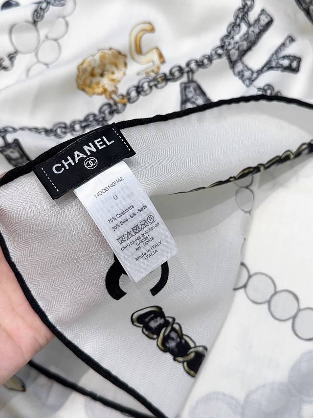 Chanel Pearl Necklace 140*140 New Arrival, Silk Velvet Style. Gentle and serene, the logo exudes elegance! The soft and smooth feel is truly comforting! New Chanel classic element silk cashmere scarf! Those in the know will fall in love at first sight. Its biggest advantage is: it's incredibly flattering! Stylish, feminine, and sophisticated, without being frivolous. Wearing this style gives you a super powerful aura. The overall effect is generous, appropriate, and classy. Velvet jacquard craftsmanship! A truly stunning design, available in two colors perfect for everyday wear! The actual product is beautiful! High-end silk, soft fabric, exquisite printing and dyeing, high-quality! The soft and smooth feel is incredibly comfortable. Suitable for all seasons! Size: 140*140cm. Silk cashmere handmade scarf, two colors.