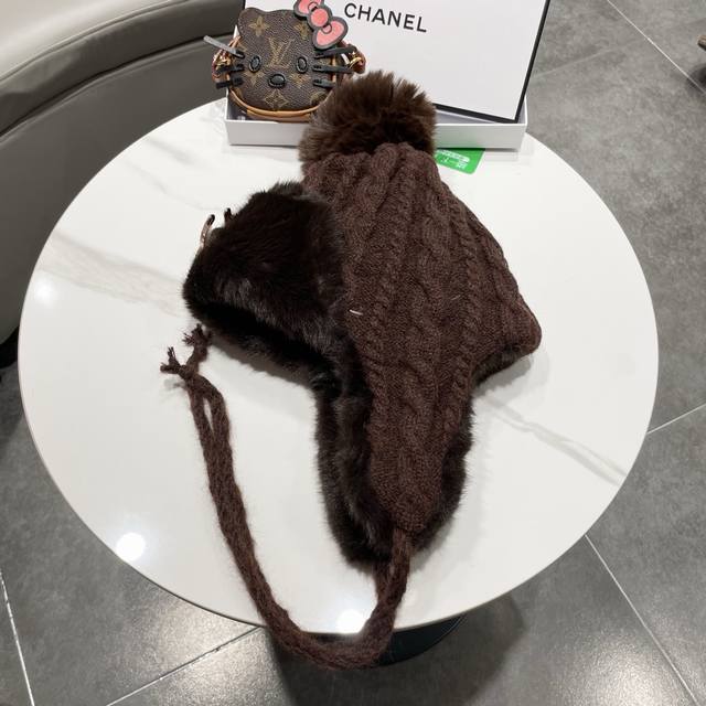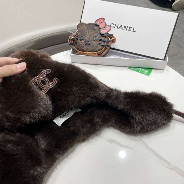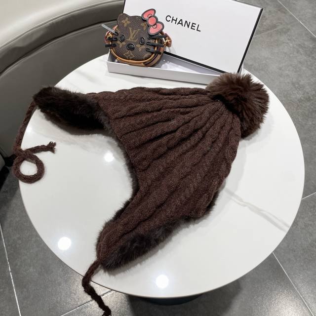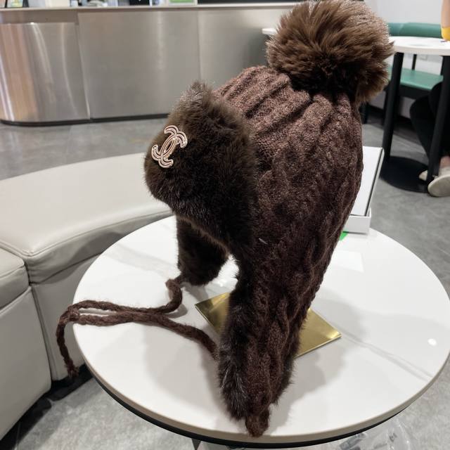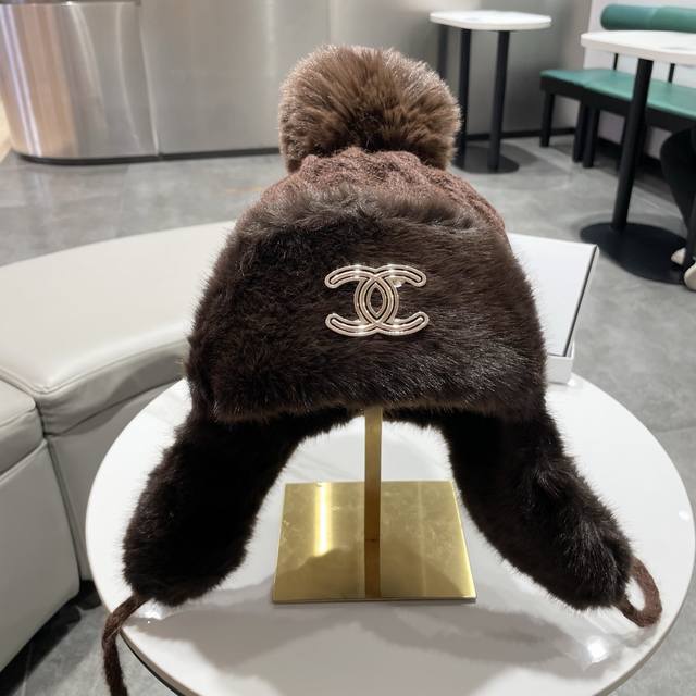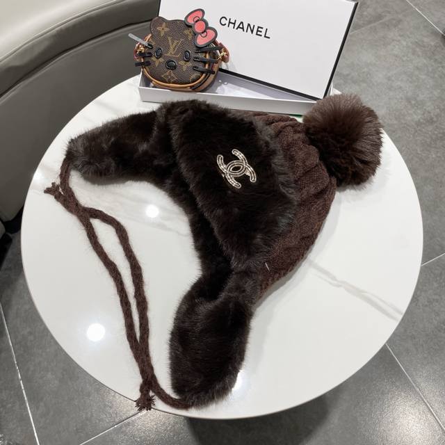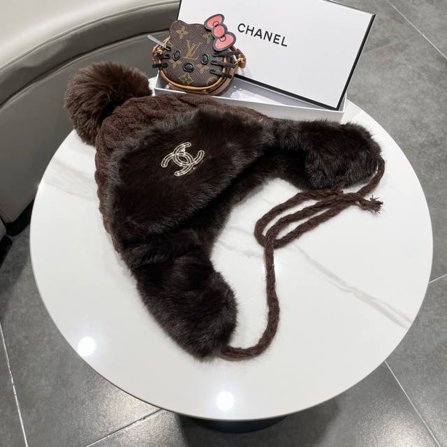 Chanel plush earflap hat with classic double C logo design. The hat body is made of high-quality plush fabric for warmth and comfort. Hat details: - Classic woven texture with plush lining - Double C logo embellishment for superior quality - Pom-pom decoration on the hat body for a stylish and versatile look - One size fits all head shapes