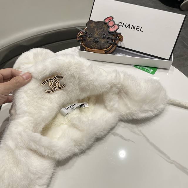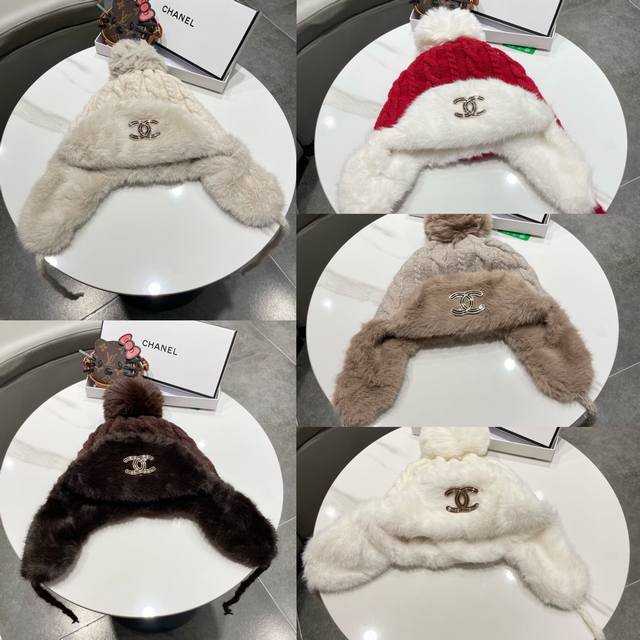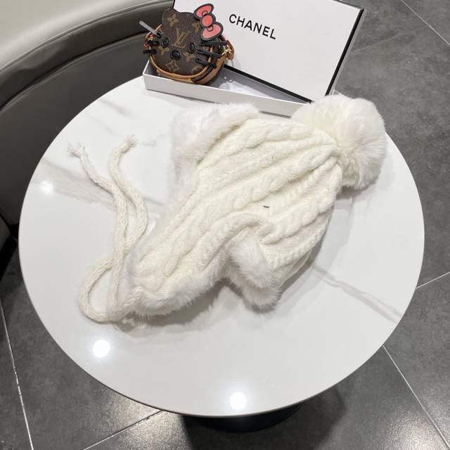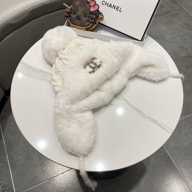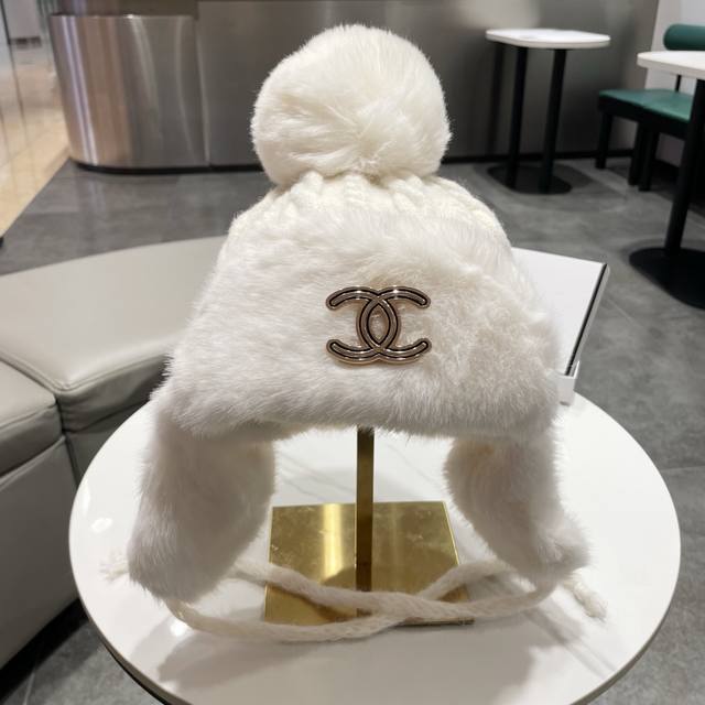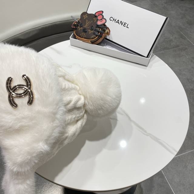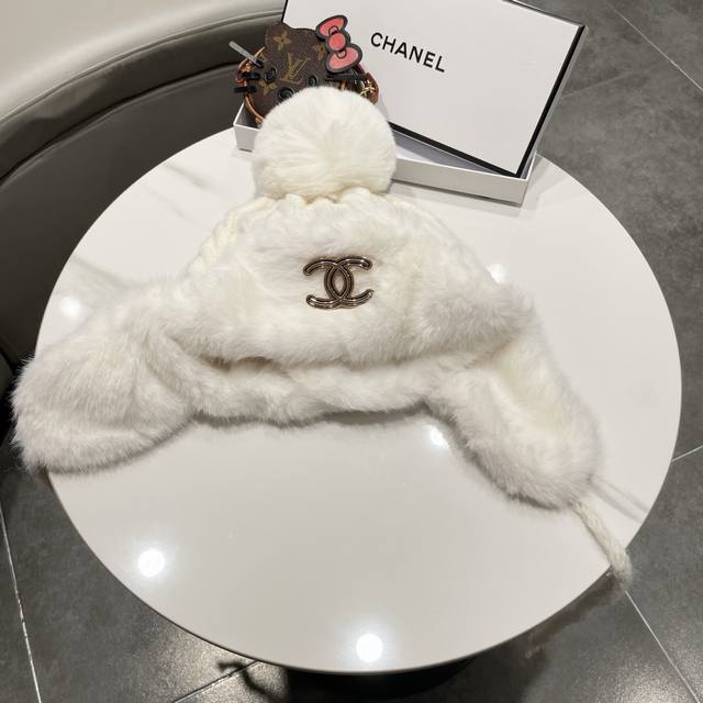 Chanel plush earflap hat with classic double C logo design. The hat body is made of high-quality plush fabric for warmth and comfort. Hat details: - Classic woven texture with plush lining - Double C logo embellishment for superior texture - Pom-pom decoration on the hat body for a stylish and versatile look - One size fits all head shapes