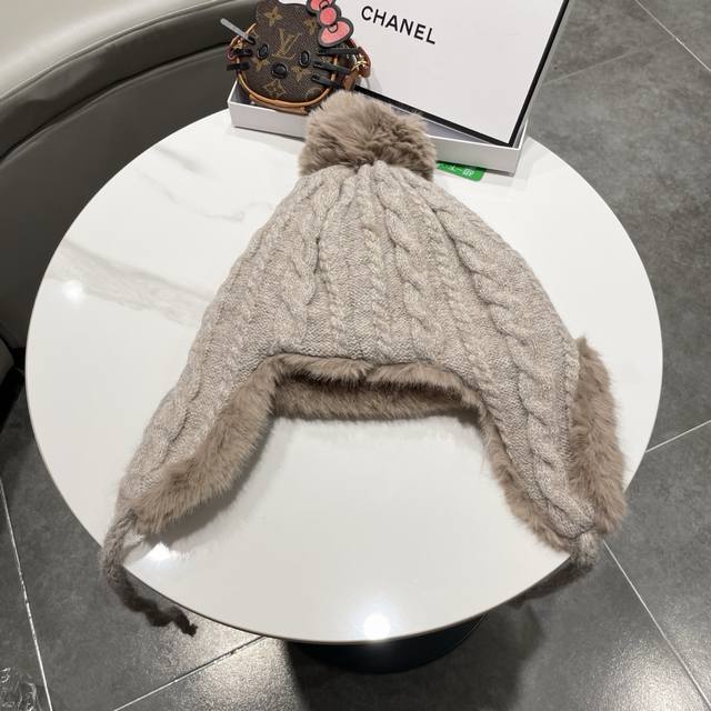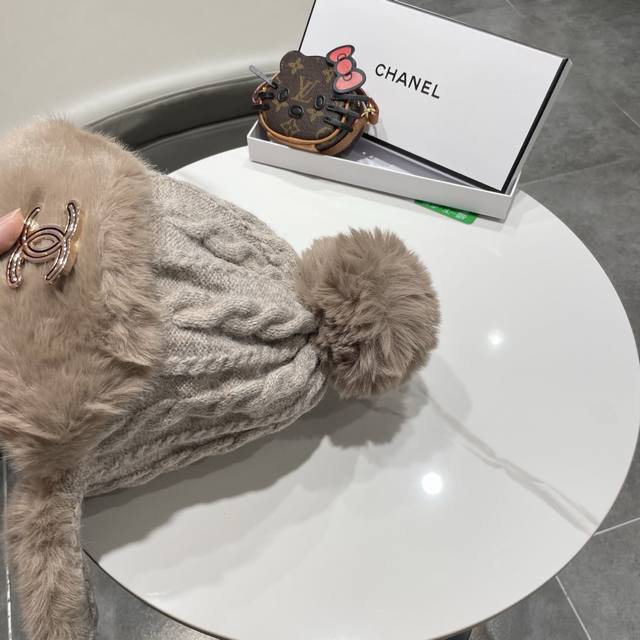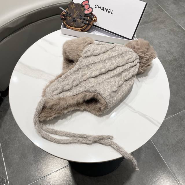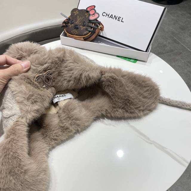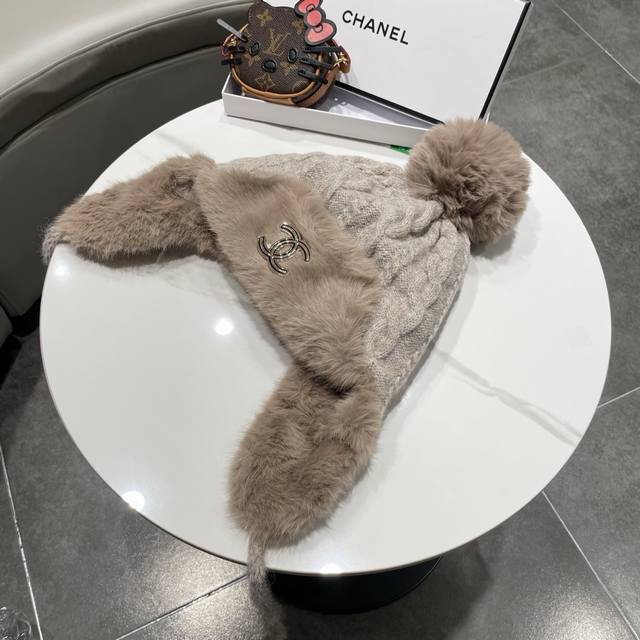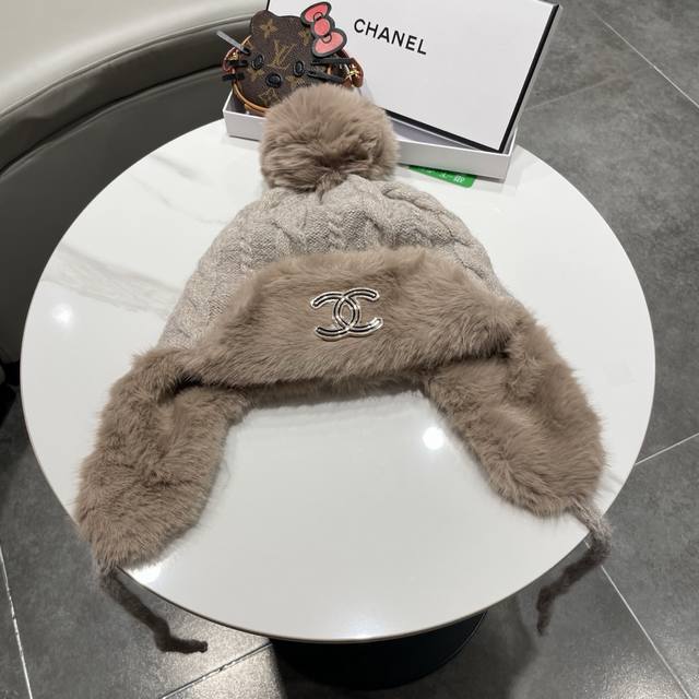 Chanel plush earflap hat with classic double C logo design. The hat body is made of high-quality plush fabric for warmth and comfort. Hat details: - Classic woven texture with plush lining - Double C logo embellishment for superior texture - Pom-pom decoration on the hat body for a stylish and versatile look - One size fits all head shapes