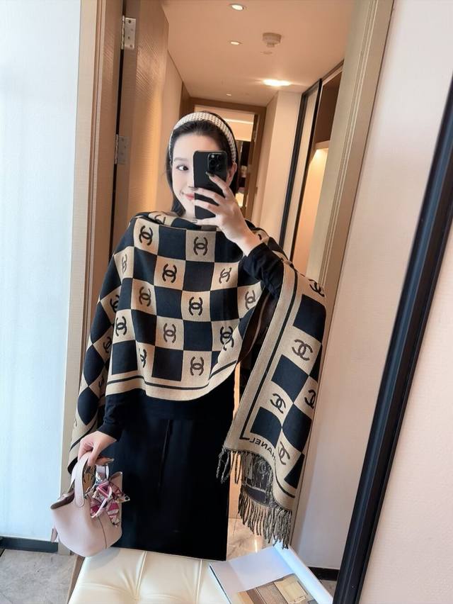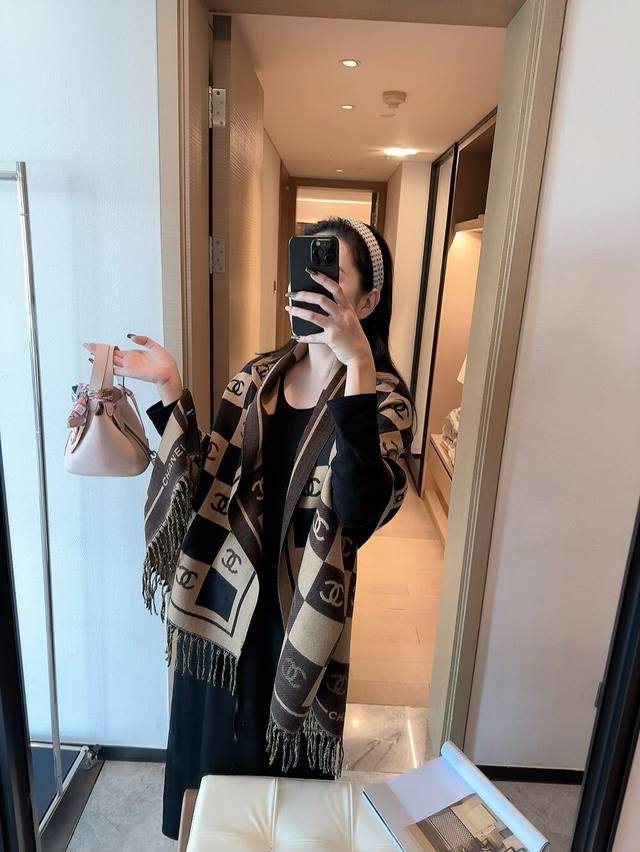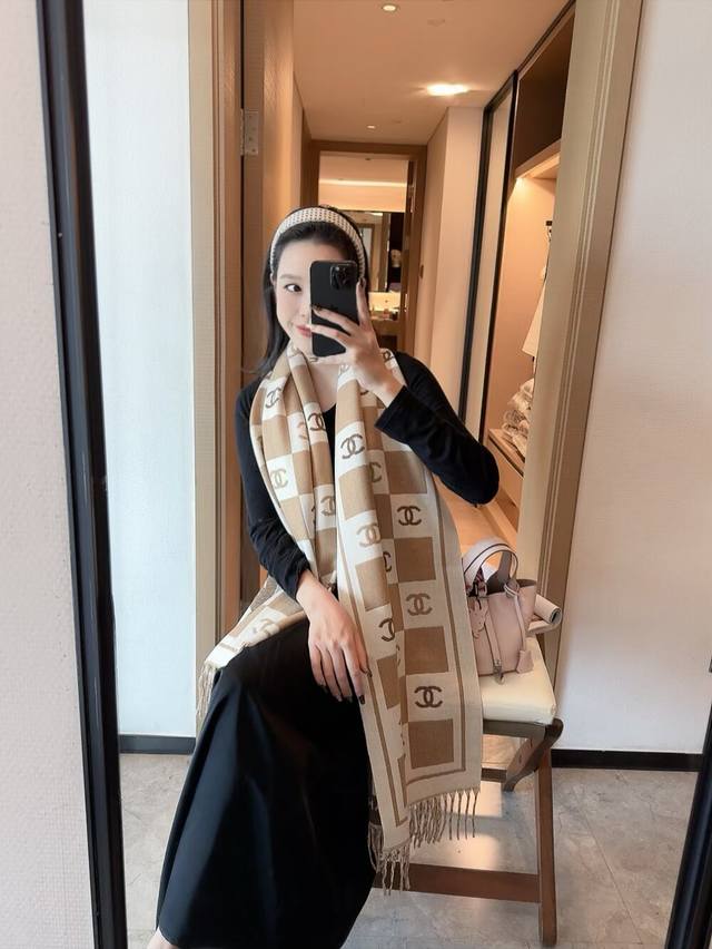 Chanel reversible scarf is absolutely gorgeous! So stylish and charming, a very sophisticated and fashionable autumn/winter item! I really love it. It's a very classic men's design, 100% lambskin, the feel is amazing! It looks good no matter how you wear it!! You can buy this style without hesitation; it's easy to wear for any age!! 60*200cm DDD