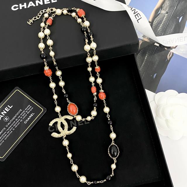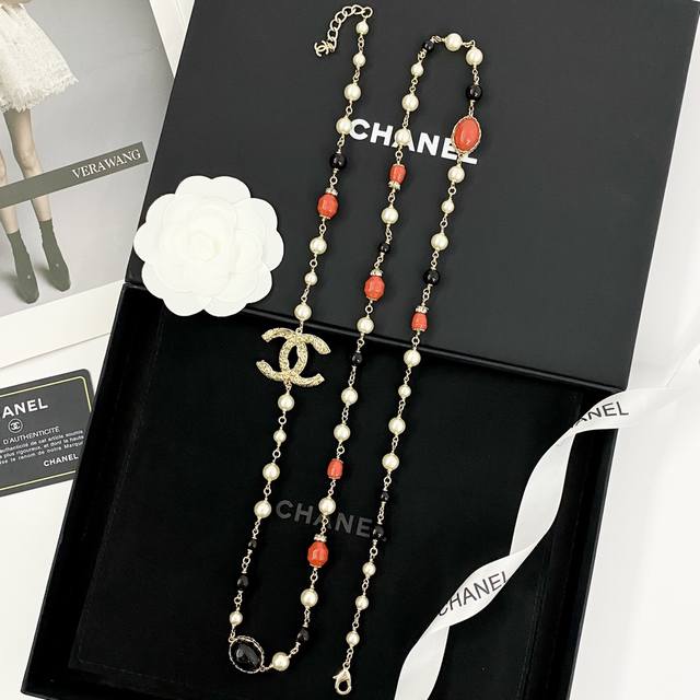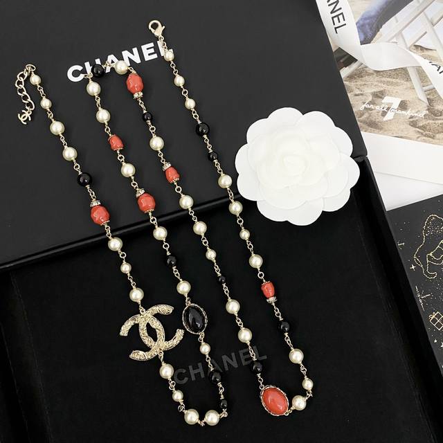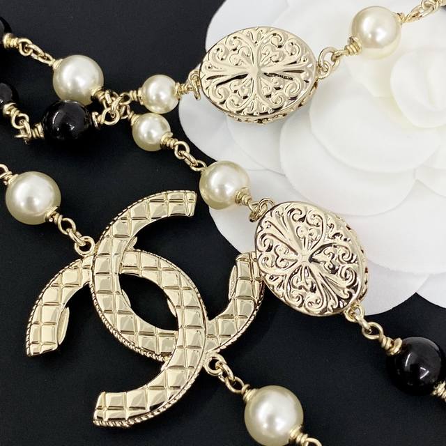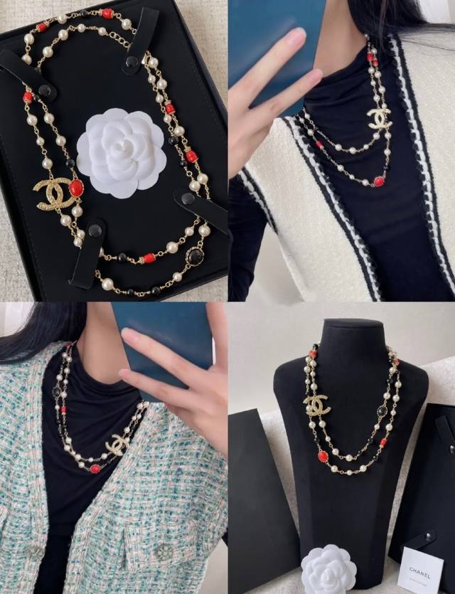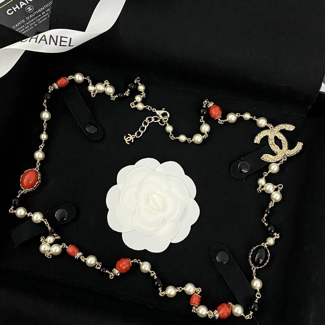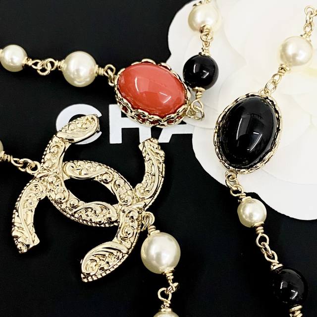 Chanel's hot-selling necklace is back! Chanel 24 vintage Southern Ruby, Black Glass, and Gold Double C Lava Embossed Pearl Sweater Necklace. The double C is embossed with lava crochet, and the back features a classic latticework for a vintage feel. The necklace features oval Southern Ruby and Black Onyx, accented with shaped spiral glass and Swarovski pearls. The overall color scheme creates a calm, restrained, yet gentle and powerful feel, creating a vintage, elegant, and sophisticated look. Absolutely stunning!