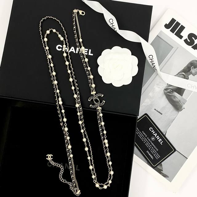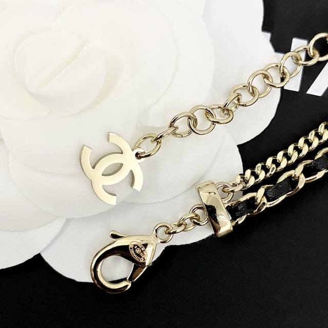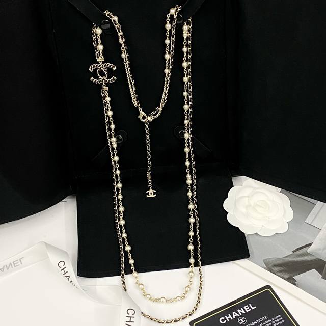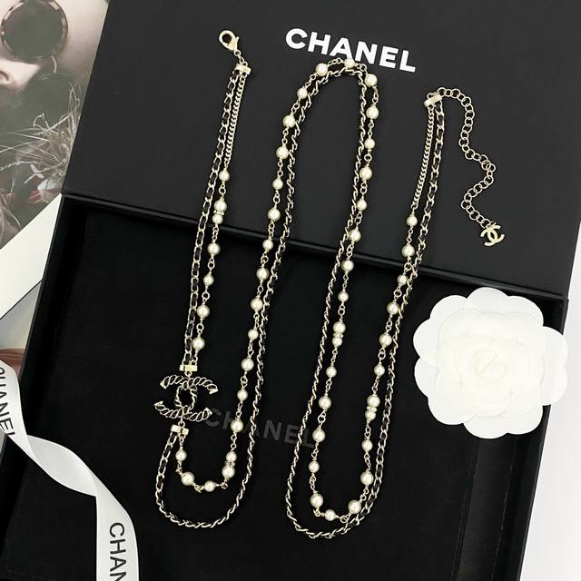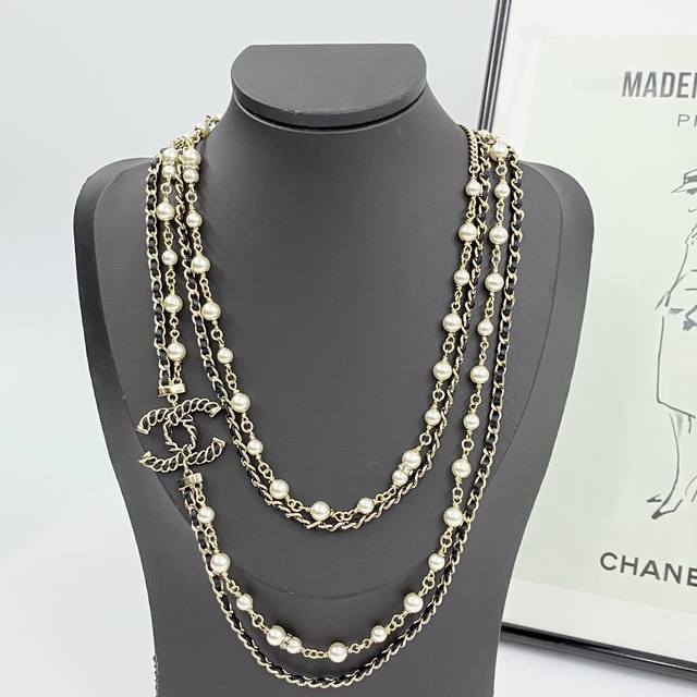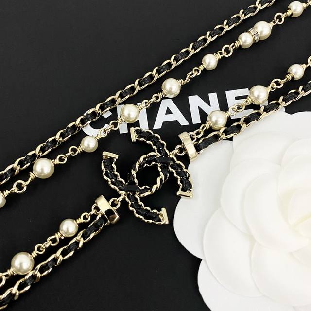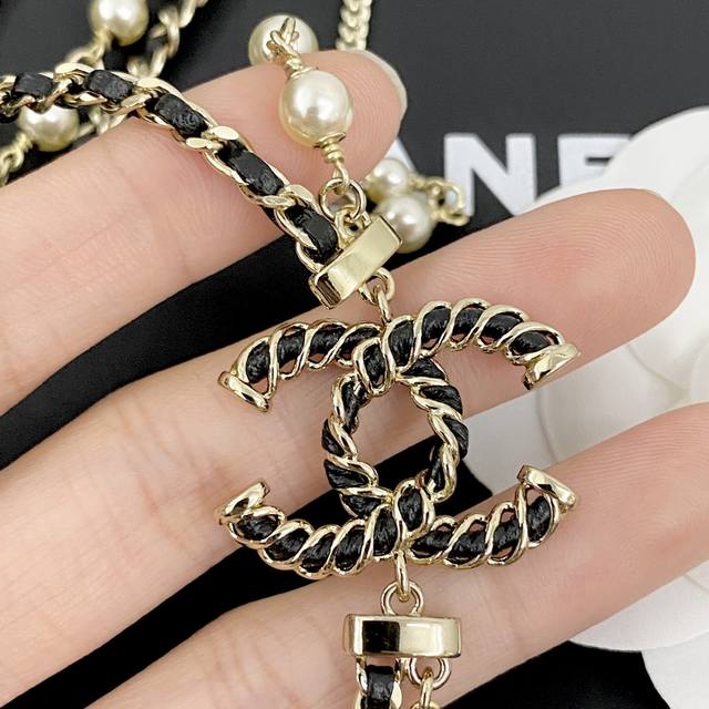 Chanel's hot-selling necklaces are now available. Chanel 24 Black and Gold Leather Double C Pearl Sweater Necklace. The spiral-threaded leather craftsmanship and the double C logo create a cool and sophisticated look. The combination of black calfskin and pearls lends it a uniquely luxurious feel, while the Coco logo accents highlight the brand's timeless elegance. The double-layered design creates a layered look, adding a touch of glamour to any outfit, whether worn with everyday wear or at a prestigious event.