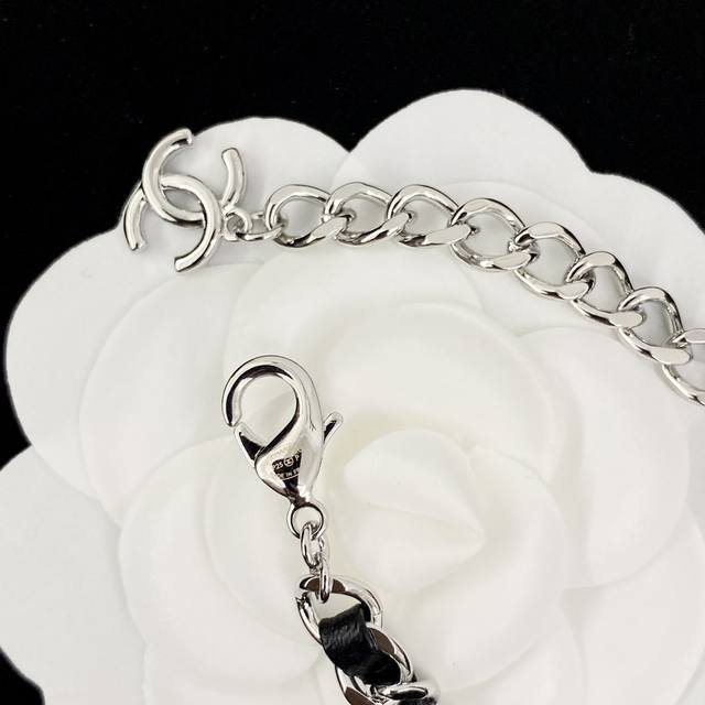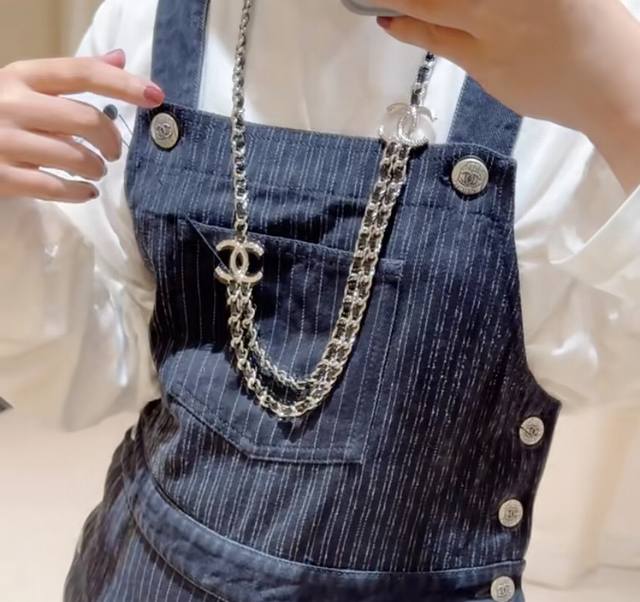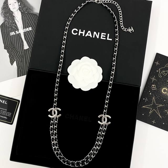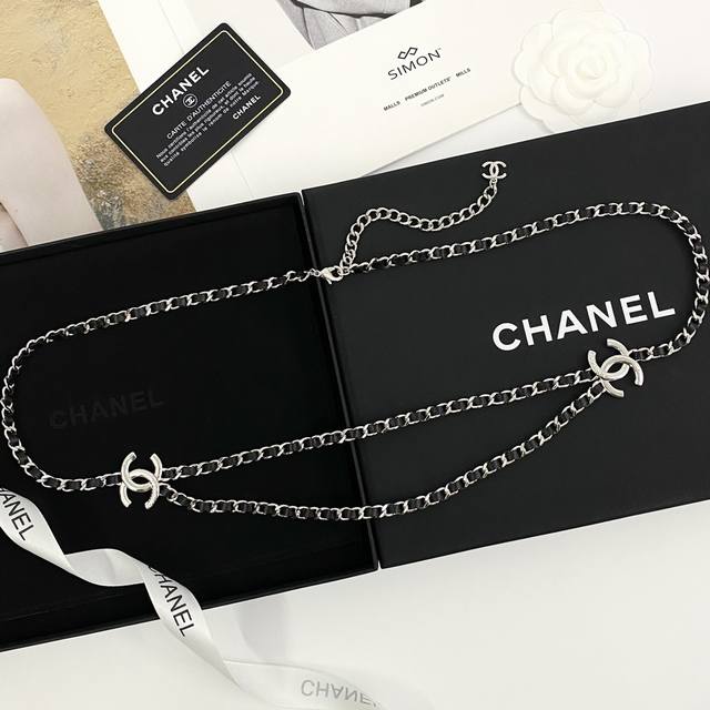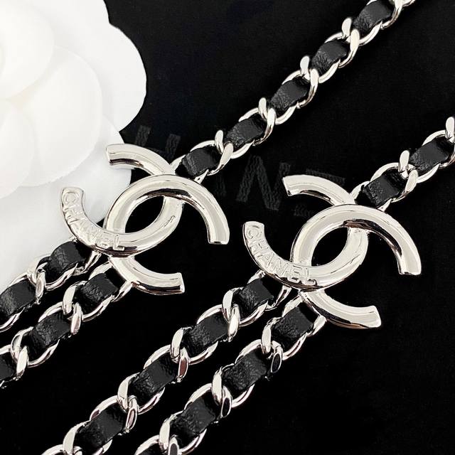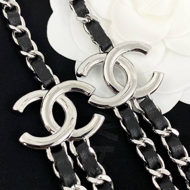 Chanel's hot-selling waist chain is now available! Chan 25p Double C double-layer waist chain with black and silver leather inserts. The silver-engraved Double C logo on each side paired with the white, silver, and black leather inserts is so cool! A versatile necklace and waist chain for two! The interwoven black and silver design exudes a cool and uninhibited vibe, creating a stylish and stylish look.