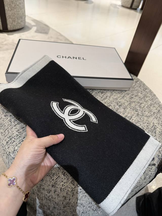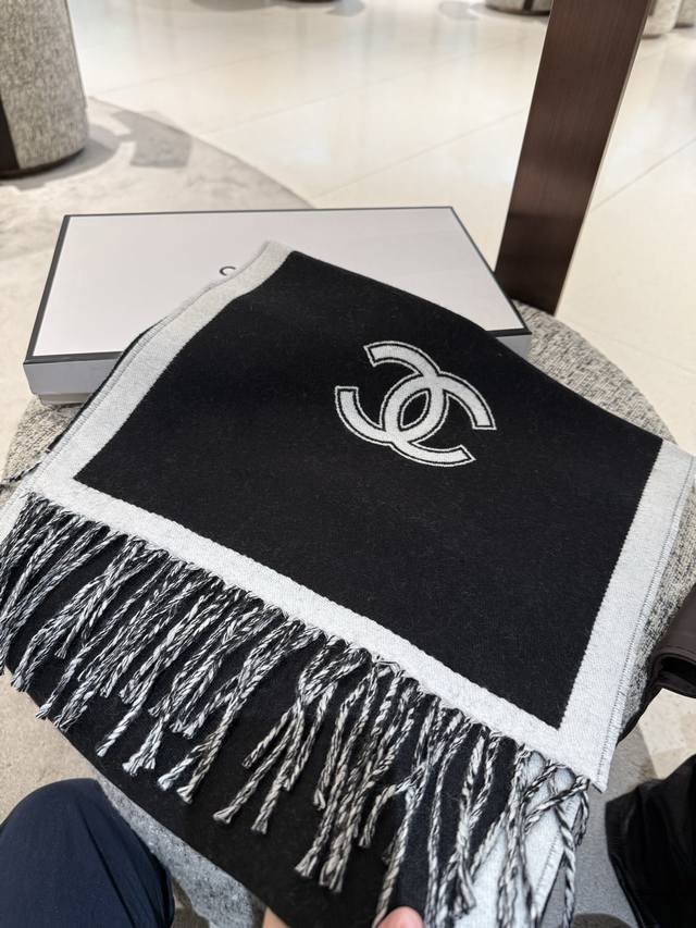 Chanel's new double-sided color-blocked jacquard scarf is predicted to be a huge hit! The double-sided jacquard design with completely opposite colors and patterns on both sides is truly ingenious. The oversized brand logo and double C color-blocking embellishments adorn the entire scarf, making it incredibly luxurious. The fabric is absolutely stunning. % Merino virgin wool, considered the pinnacle of wool quality, it's not itchy at all, gentle and textured. Suitable for both men and women, versatile and flattering. A must-have! Size: 184*34cm.