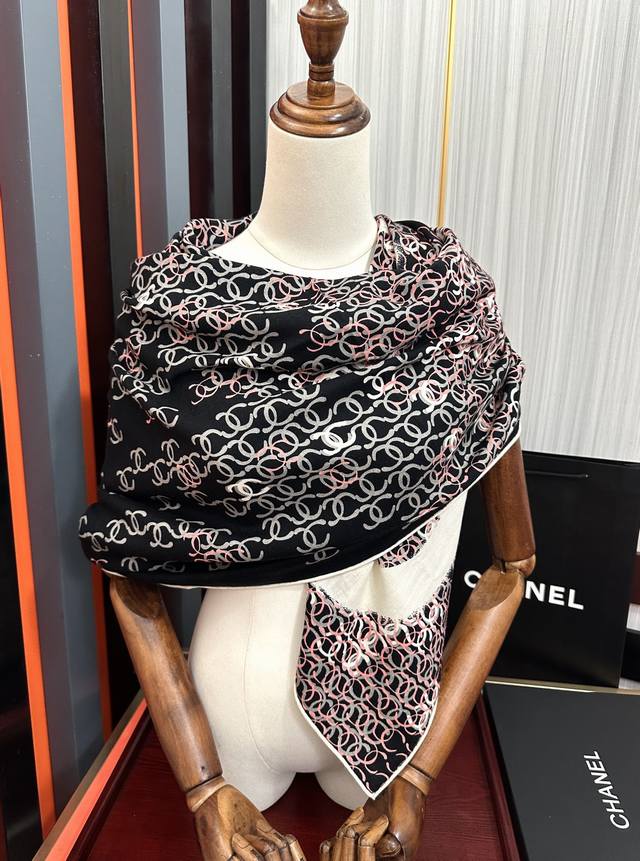 New Chanel 2025 Double-sided Same Color, Timeless Classic Double C Elegance Coco Style~ The new Chanel fabric from this season is incredibly high-end, truly super soft, silky smooth, and very resilient, not easily snagged! This year's new collection~ I'm truly captivated by the design. A Chanel scarf is the perfect accessory for you [lips]. The effect on the body is simply elegant and sophisticated, very dynamic, with elegant layers and texture. A must-have for Chanel fans! The effect on the body is undeniably beautiful, and it complements clothing, shoes, and bags perfectly [beer]. The actual product is even more beautiful. Classic black and white. Size: 140X140, Material: 30% silk + 70% silk cashmere, 2 colors available.