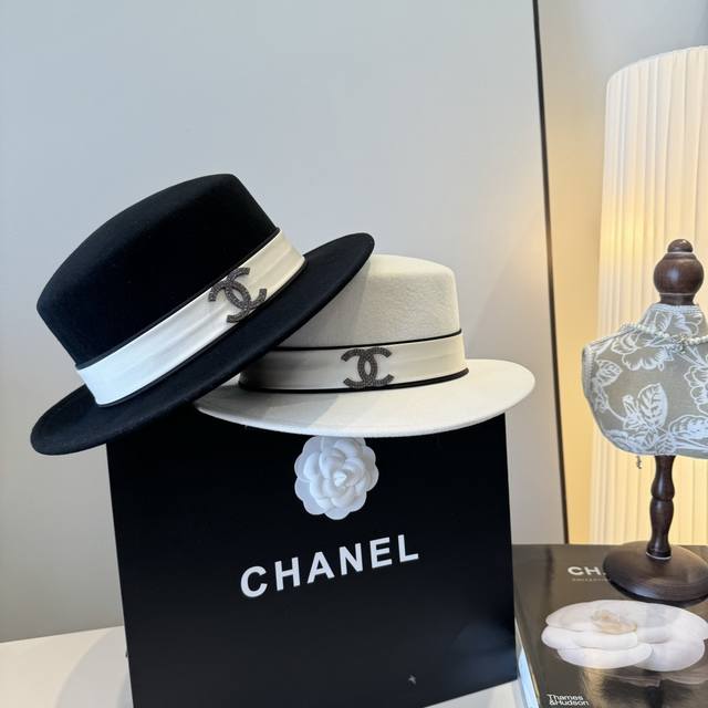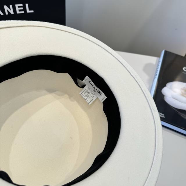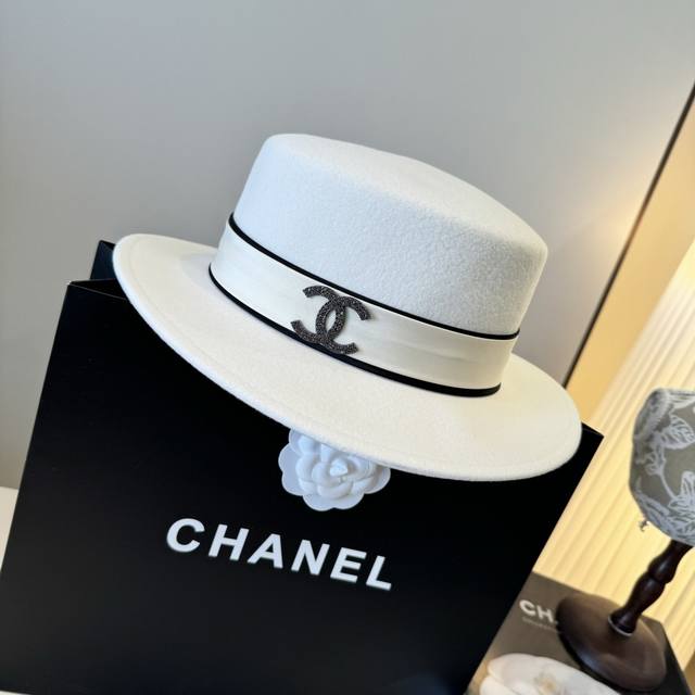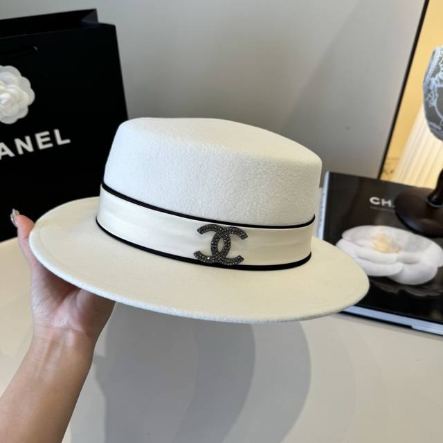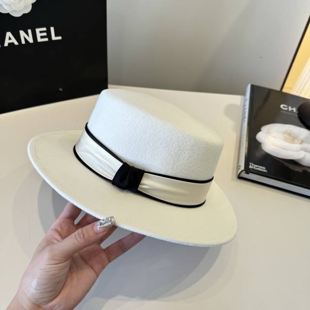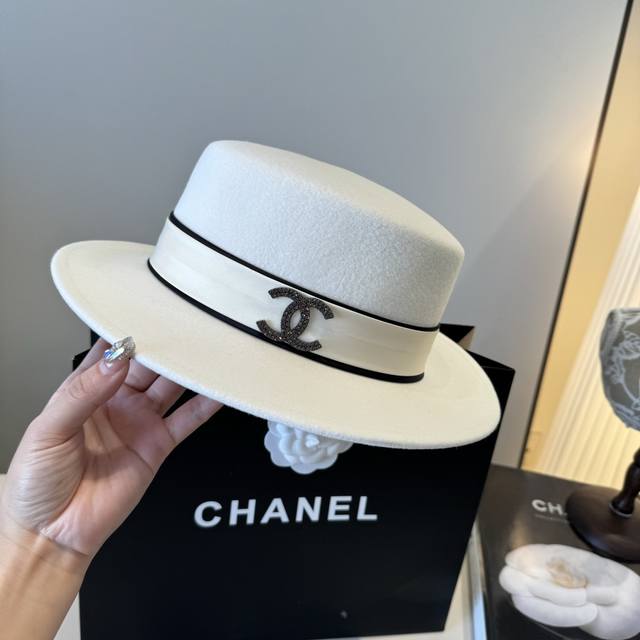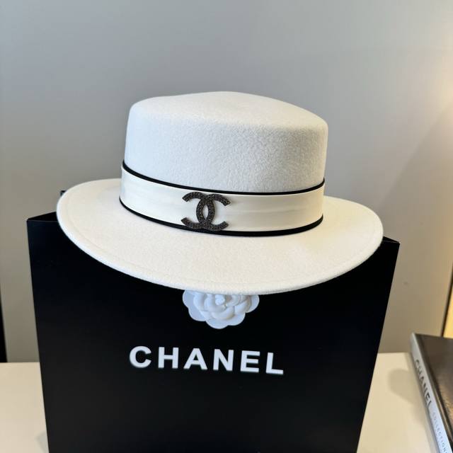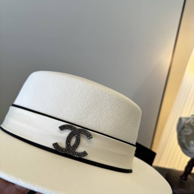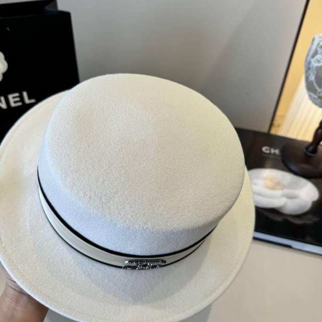/ White Chanel new wool hat, flat top hat, 100% wool fabric%, head circumference 5