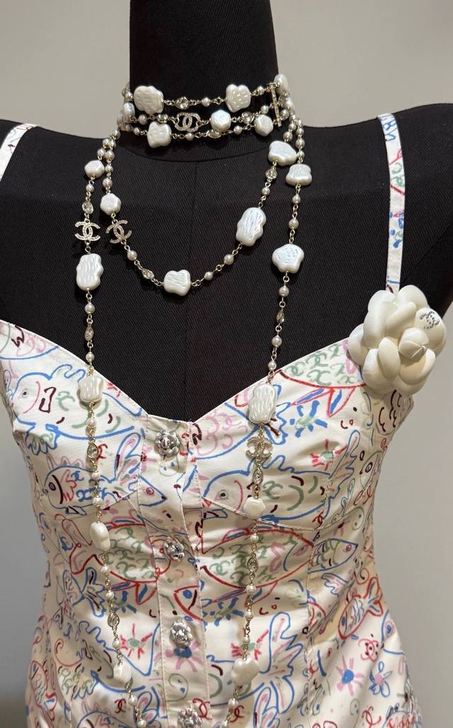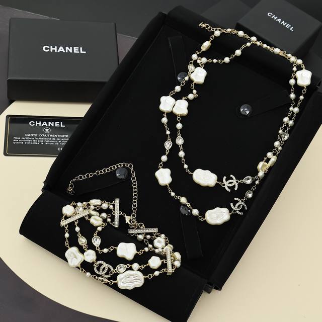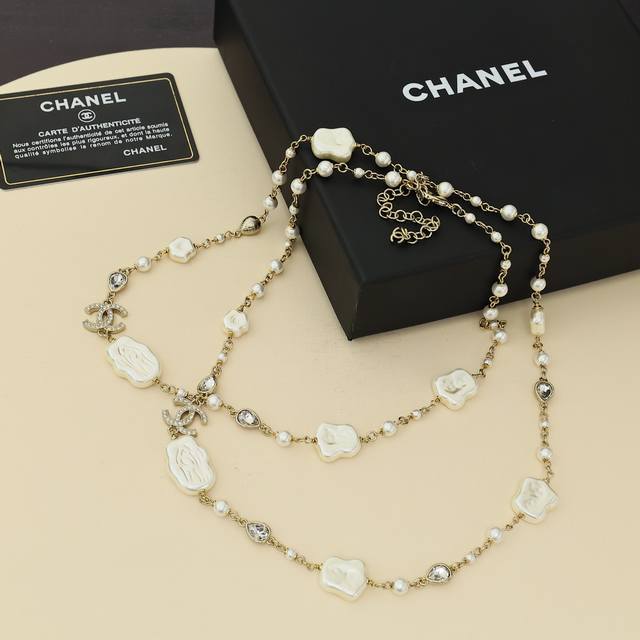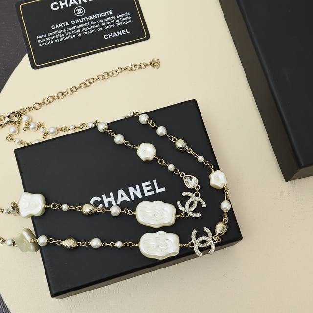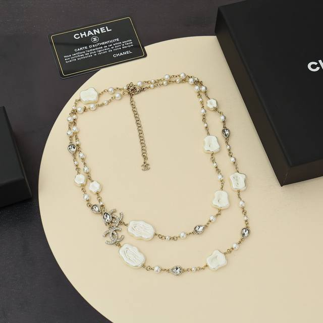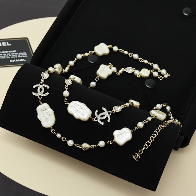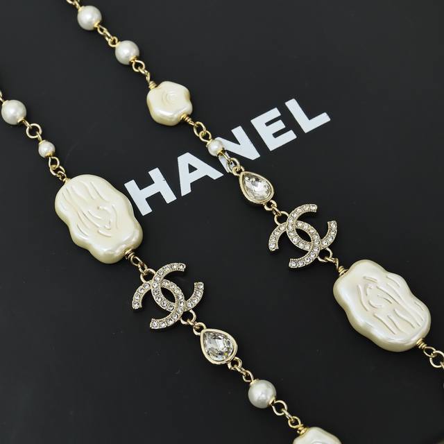Chanel 25A cloud resin pearl light gold full diamond double C teardrop crystal diamond long necklace sweater chain