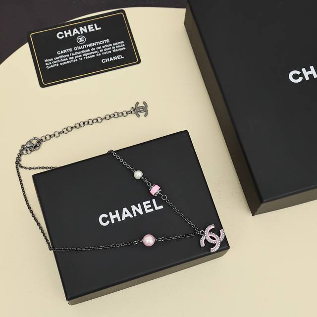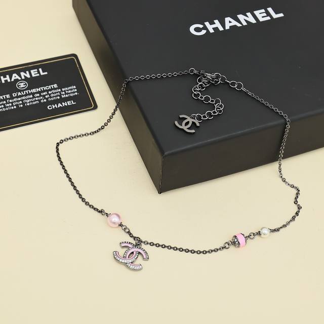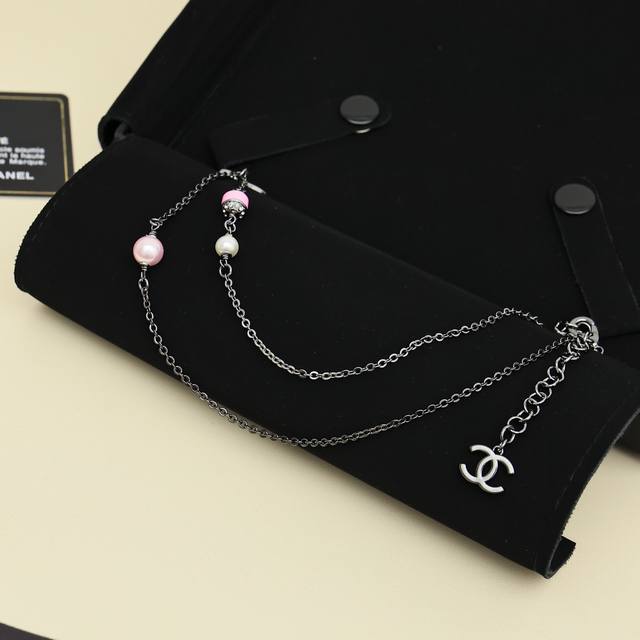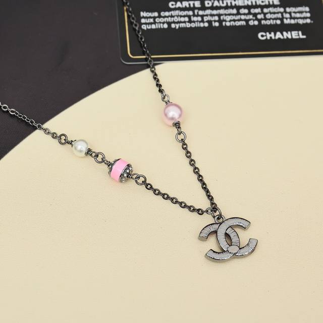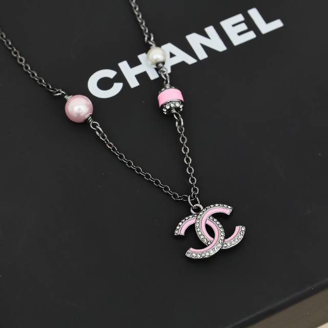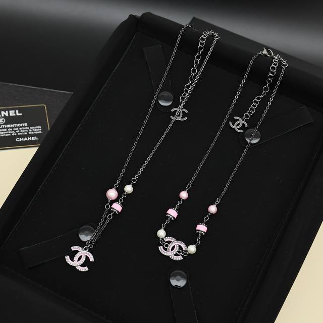 Chanel 25B Iridescent Beaded Double C Necklace. Love it at first sight, perfect for autumn and winter. Another super versatile necklace that's easy to layer and match. The black and silver chain paired with pink enamel creates a sweet and charming look.