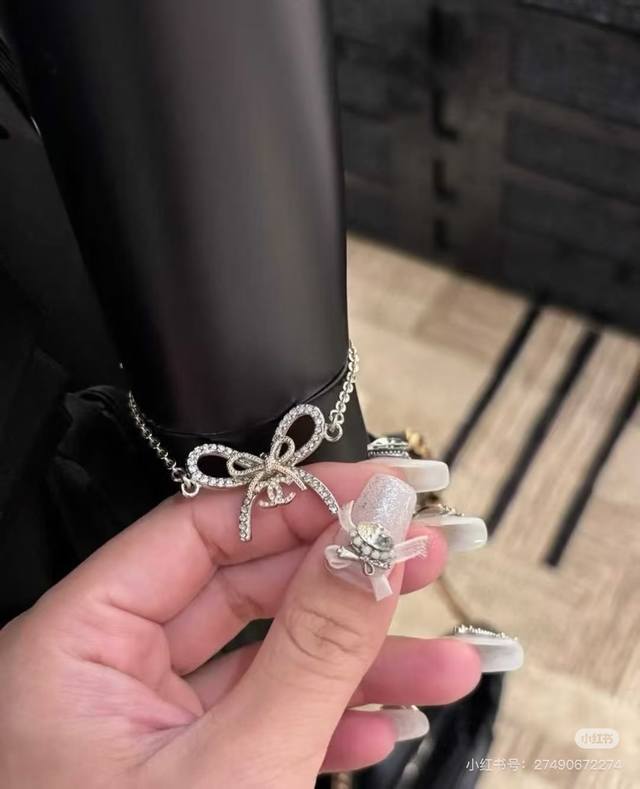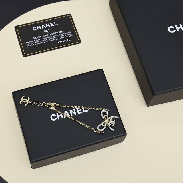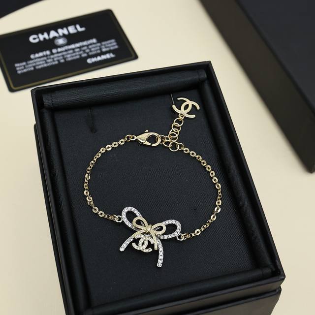 Chanel 25K Collection Bow Bracelet, made of metal with gold plating and crystal inlay, exquisite and elegant. The bow is paired with the double C logo, exuding brand prestige. The chain is adjustable to fit different wrists, perfect for everyday wear or pairing with formal attire.