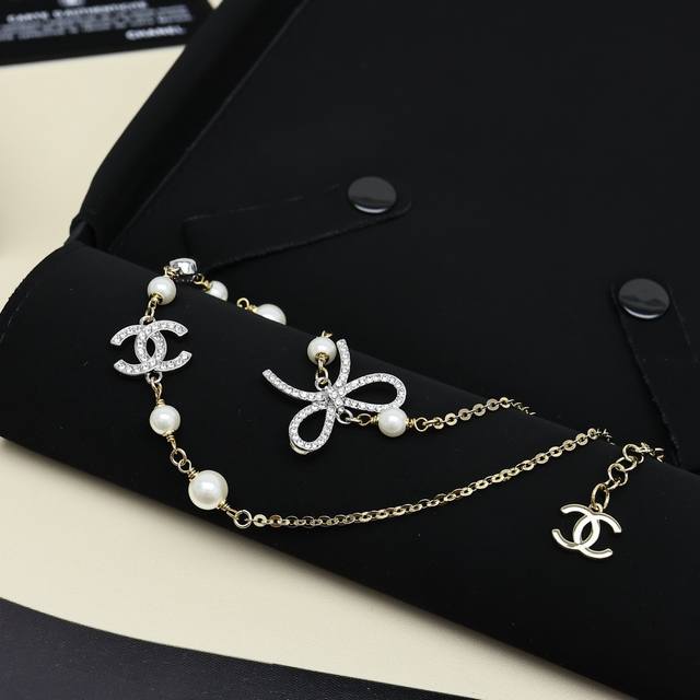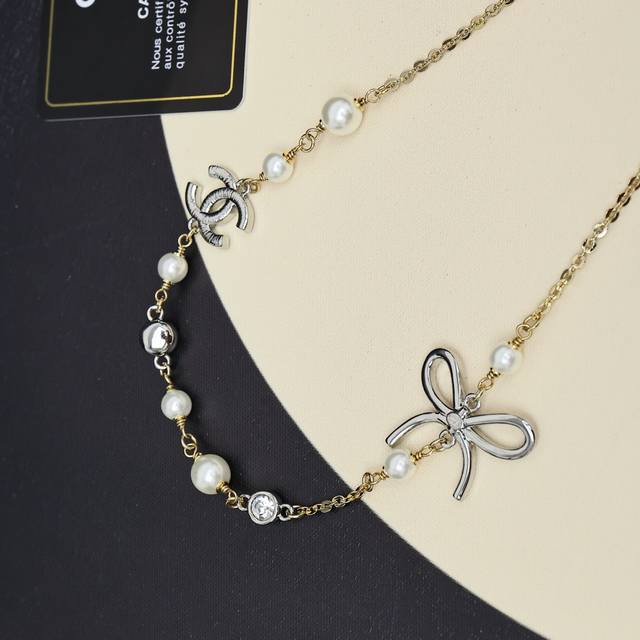 Chanel 25K silver pearl bow necklace. This necklace combines pearls, a bow, the double C logo, and Swarovski crystals for an elegant and luxurious look. The metal chain is vacuum-plated and adorned with imitation pearls and crystals, showcasing exquisite details. The bow and double C logo are highly recognizable. The chain length is moderate, making it versatile for various outfits. It's perfect for everyday wear or formal occasions, effortlessly elevating your style.