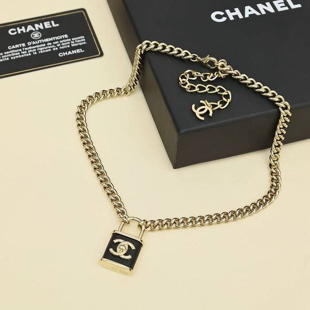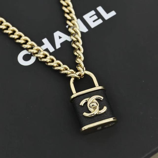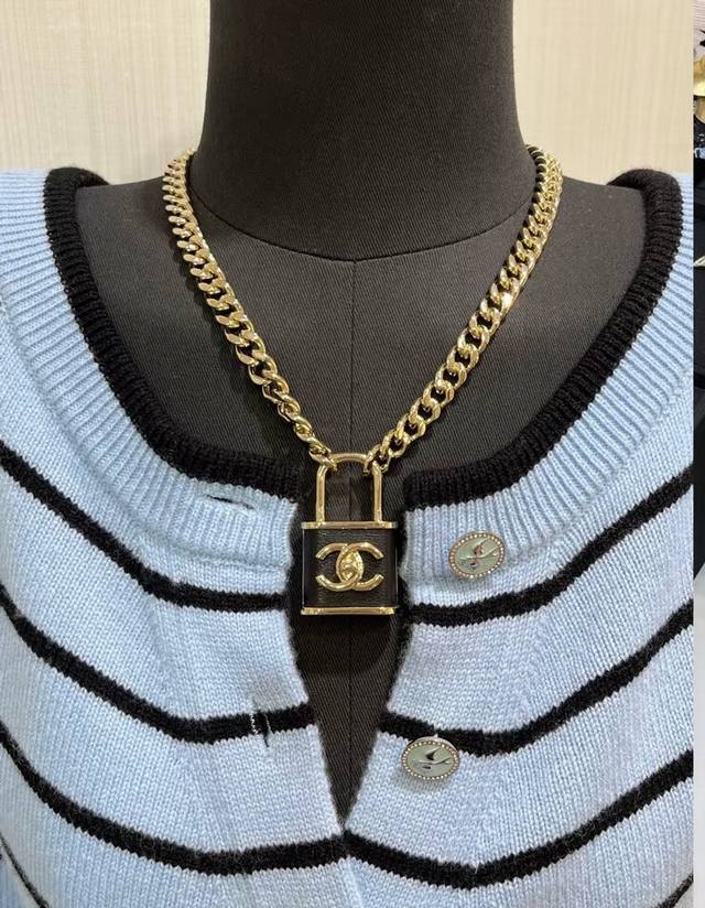 ) Made of metal and black enamel, this necklace features the iconic double C logo and a vintage padlock design. The interlacing chain of varying thicknesses adds a touch of modern punk style. The moderate length makes it suitable for everyday wear or pairing with formal attire, effortlessly elevating any look. (