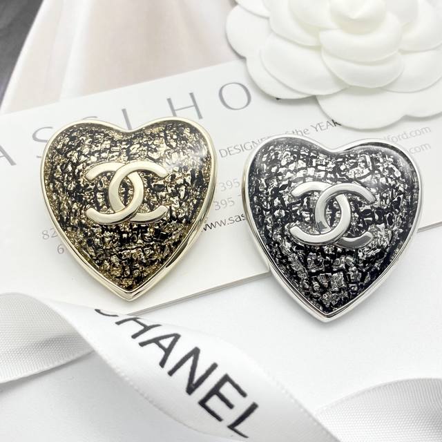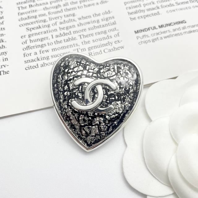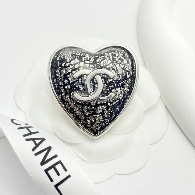 Chanel 25 Black Silver Double C Lace Glass Heart Brooch
