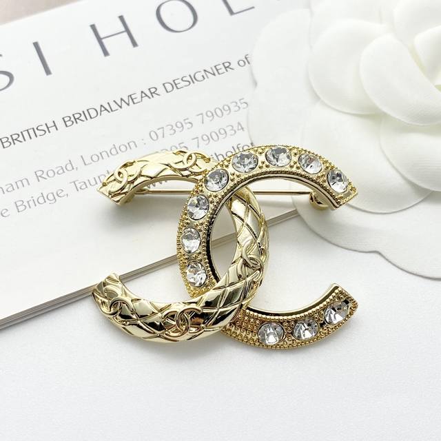 Half C-shaped with rhinestones, half embossed double C quilted pattern