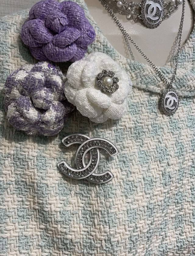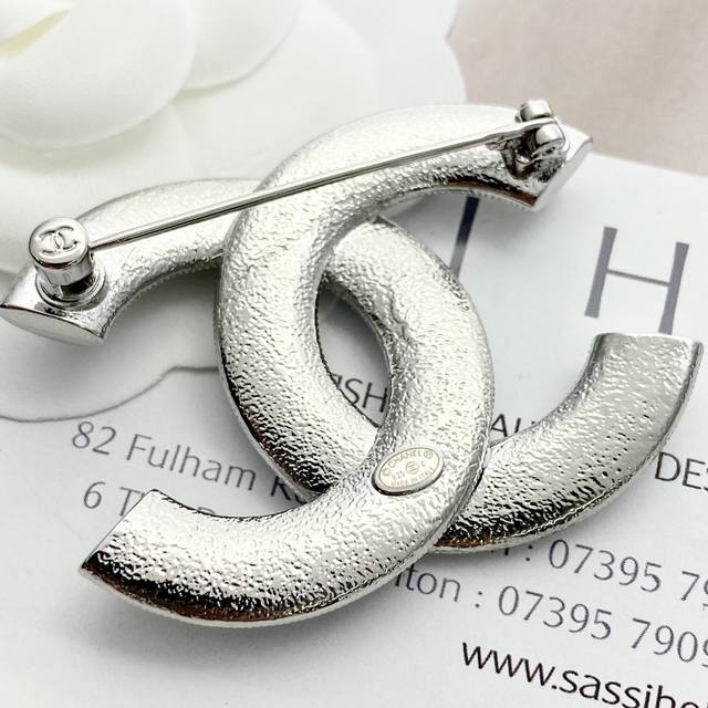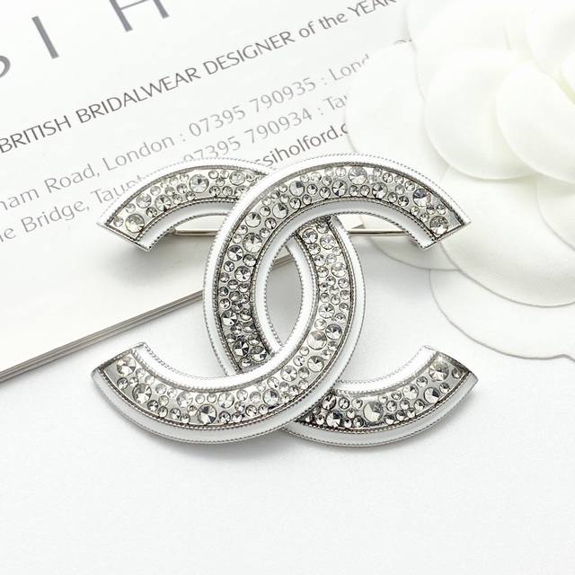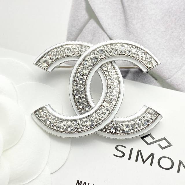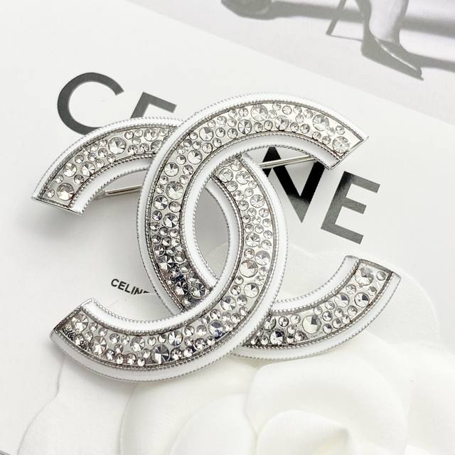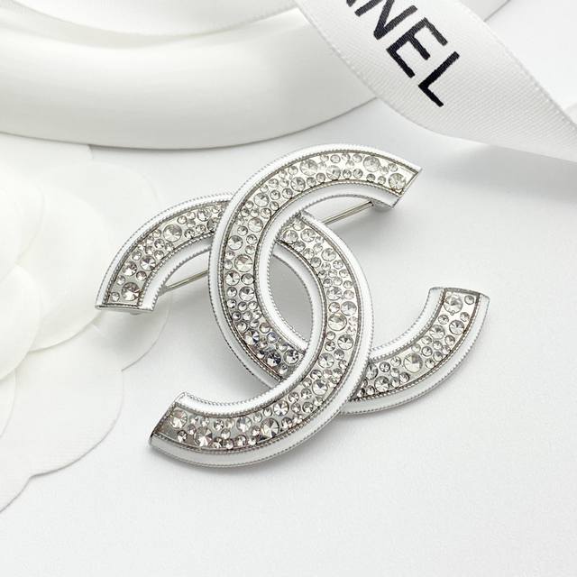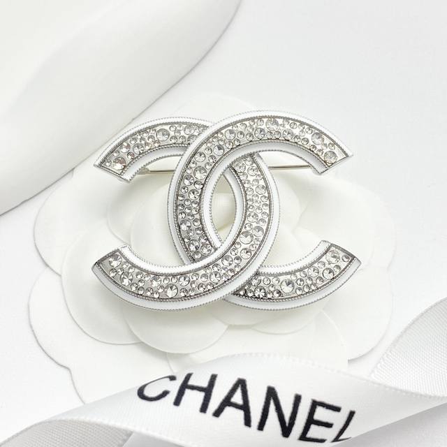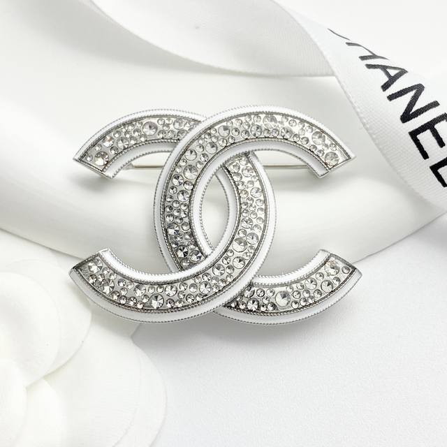 Chanel 25 White Enamel Rhinestone Double C Brooch