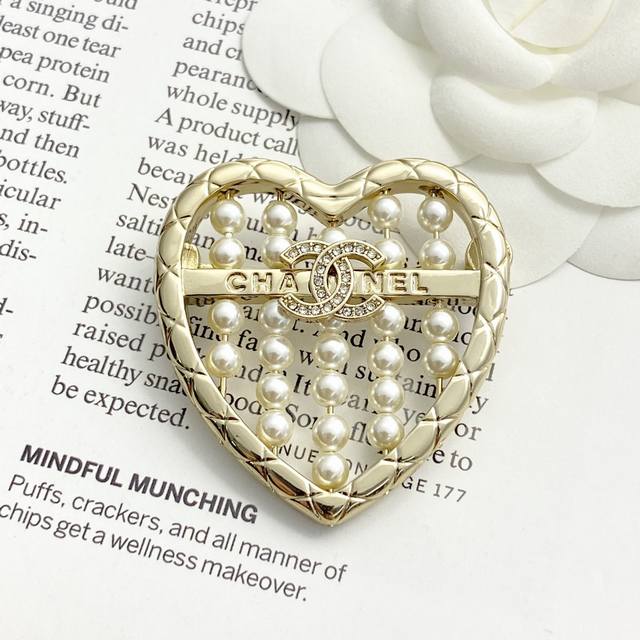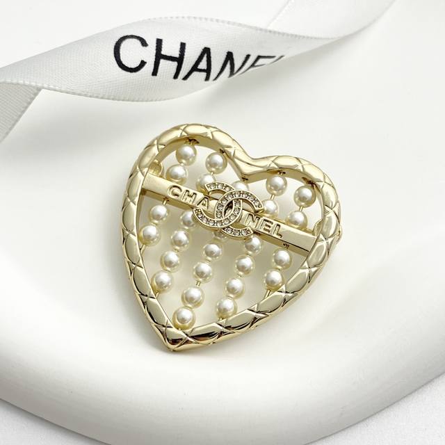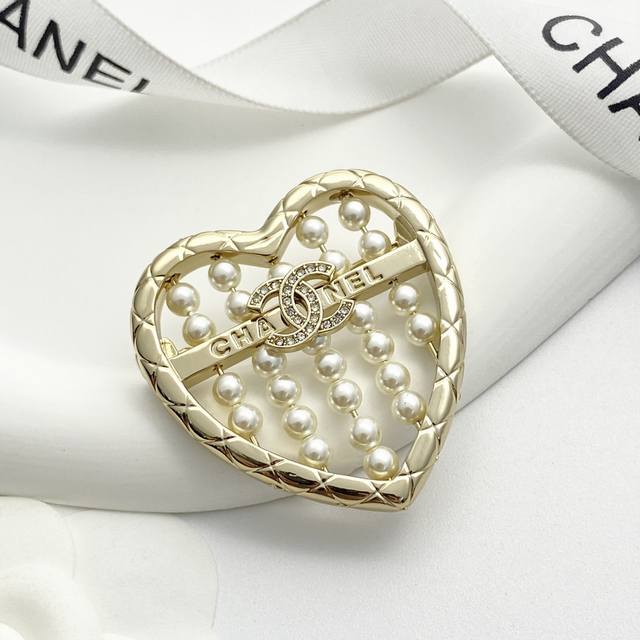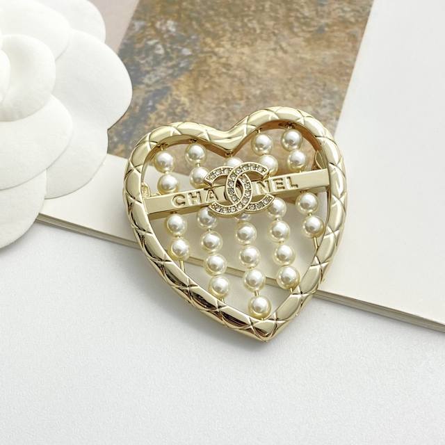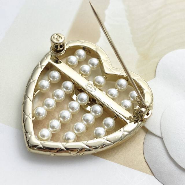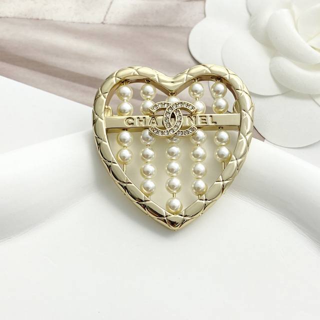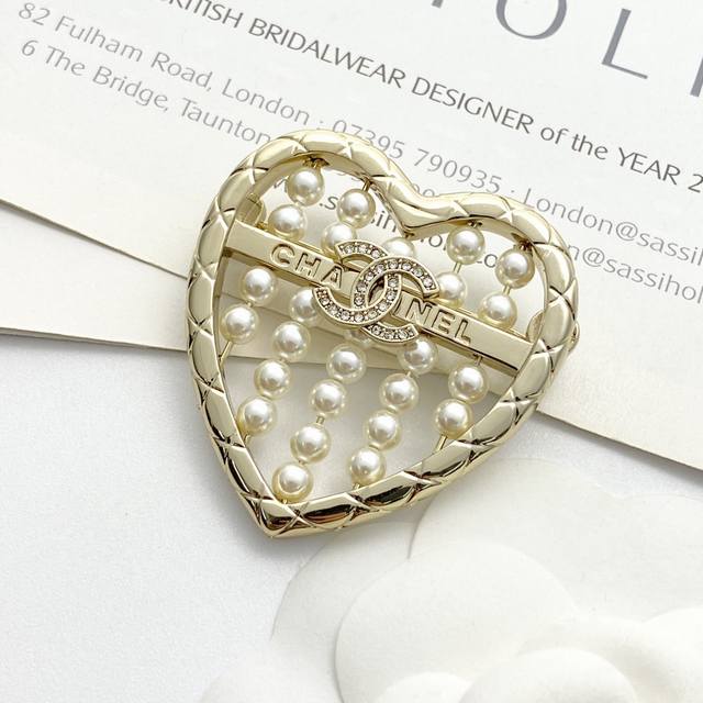 Chanel brooches are a hot seller! New arrival! Chan 25 light gold, diamond-studded, double C, pearl, abacus heart brooch. This small abacus brooch features a diamond-patterned, hollowed-out heart with pearls. This design is so unexpected, incorporating traditional Chinese elements. It's very creative and refined.