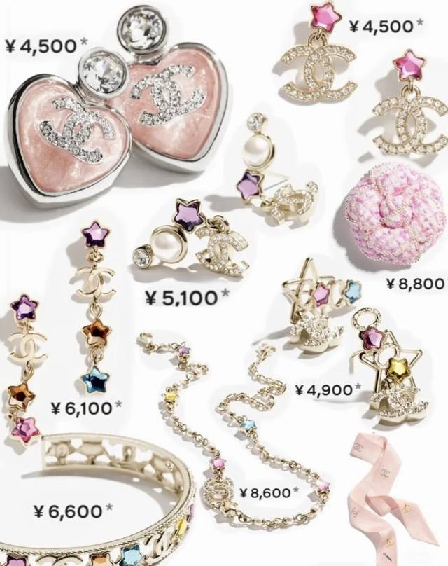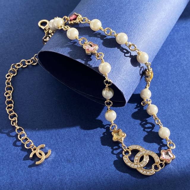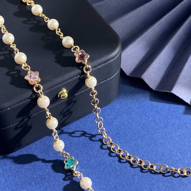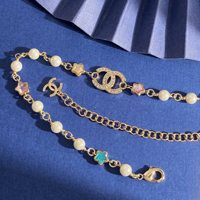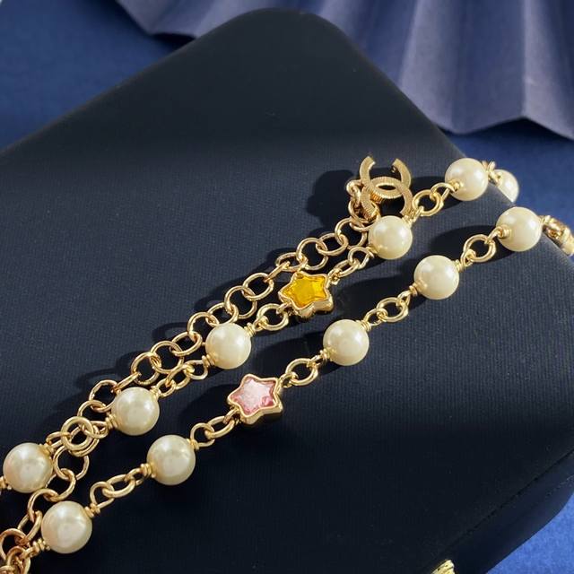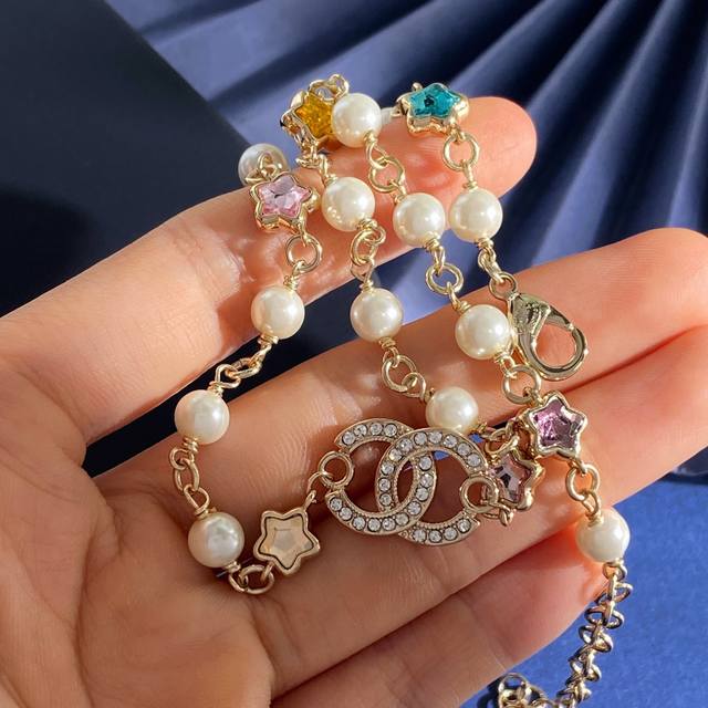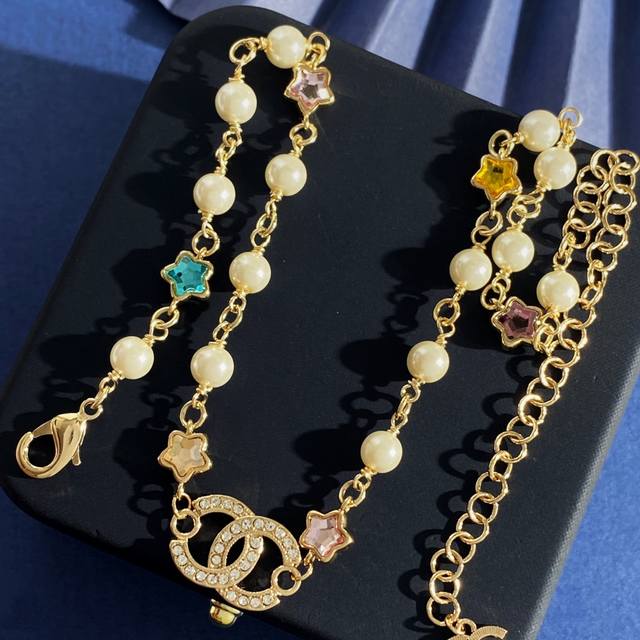 Chanel Chanel small fragrance style fashion design dopamine five-pointed star-shaped colored diamond double C letter full diamond pearl necklace brass material weight about 19.4G necklace length about 34cm + 11.5cm