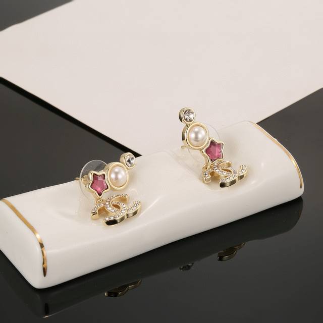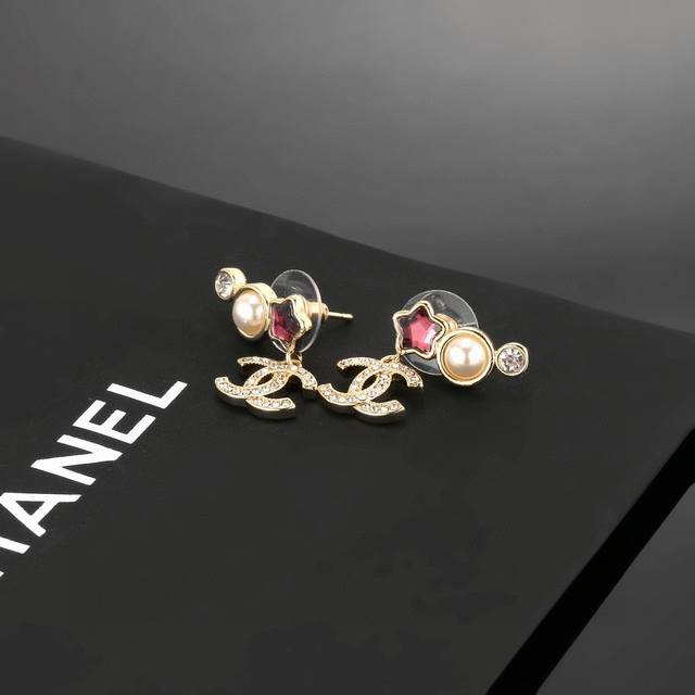 Chanel colorful star stud earrings flatter the face shape. The gold metal trim gives them a mysterious, mature, and vintage feel. The classic double-C metal logo is versatile! (Earrings available from