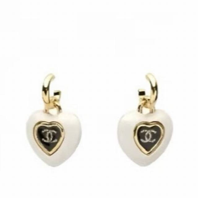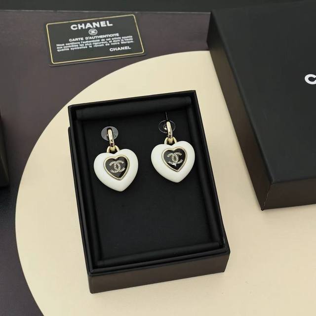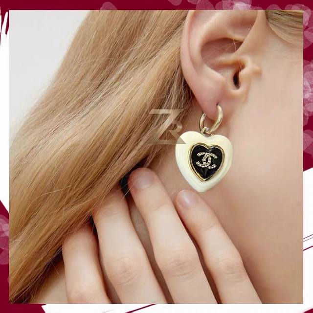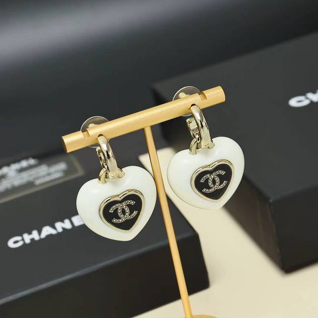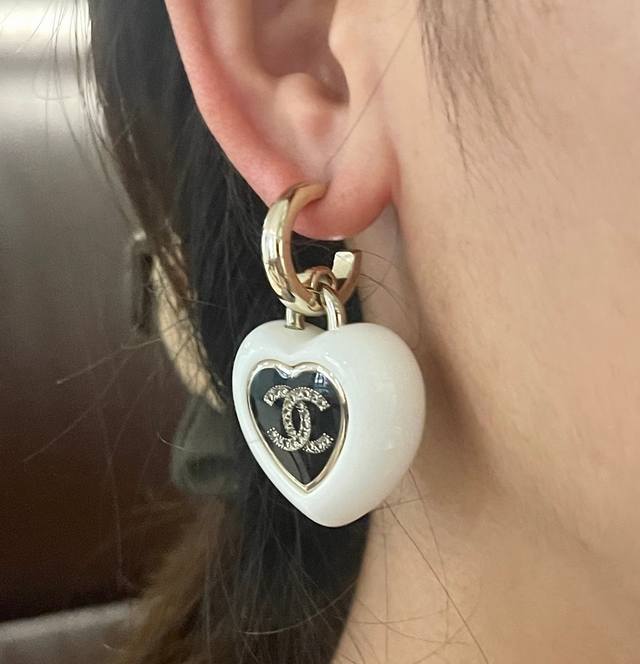 Chanel Heart-Shaped Acrylic 3D Heart Crystal Letter Earrings. Black and white with metal trim, featuring the classic double C logo at the center. Elegant and sophisticated, these earrings are made of lightweight and durable acrylic, perfect for everyday wear or formal occasions. The metal hook design ensures a secure fit. A perfect blend of classic Chanel elements and modern style, these earrings are ideal for those who love sophisticated fashion. They complement both minimalist and French-inspired outfits beautifully!