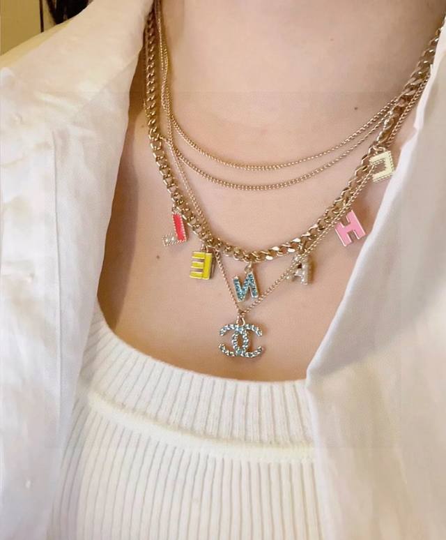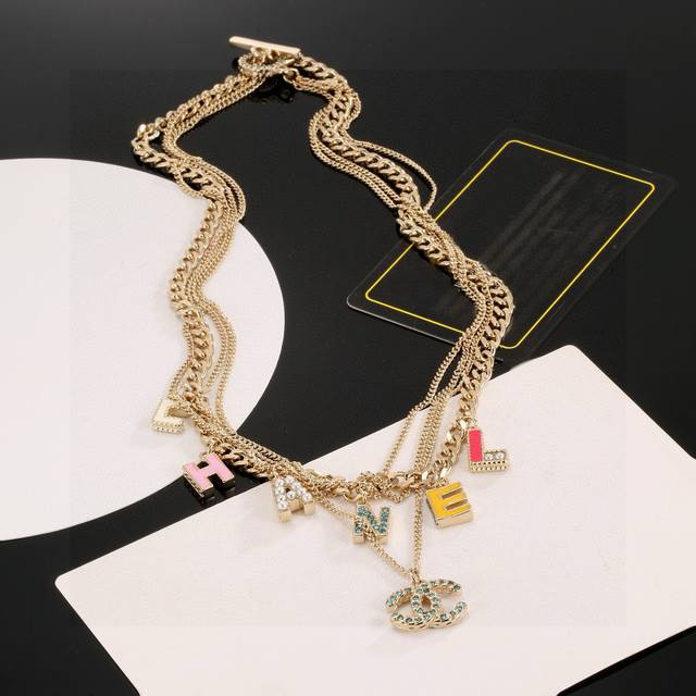 Chanel mini necklace, high-end quality, same materials as boutique items, exquisite and delicate workmanship, heavy-duty version, multi-layered chain design, simple, elegant, and particularly gentle. The classic double C is adorned with Swarovski crystals, super sparkly and luxurious. Necklace