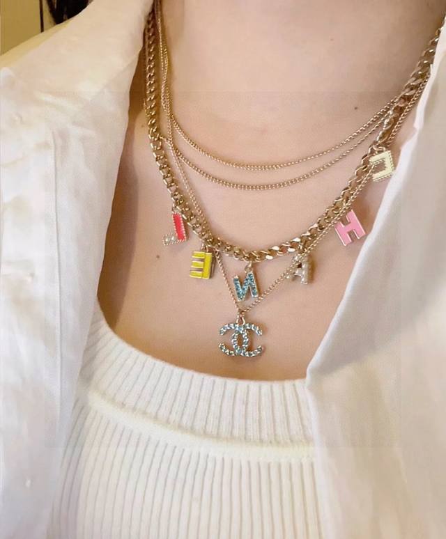 Chanel mini necklace, high-end quality, same materials as boutique items, exquisite and delicate workmanship, heavy-duty version, multi-layered chain design, simple, elegant, and particularly gentle. The classic double C is adorned with Swarovski crystals, super sparkly and luxurious. Necklace DDD