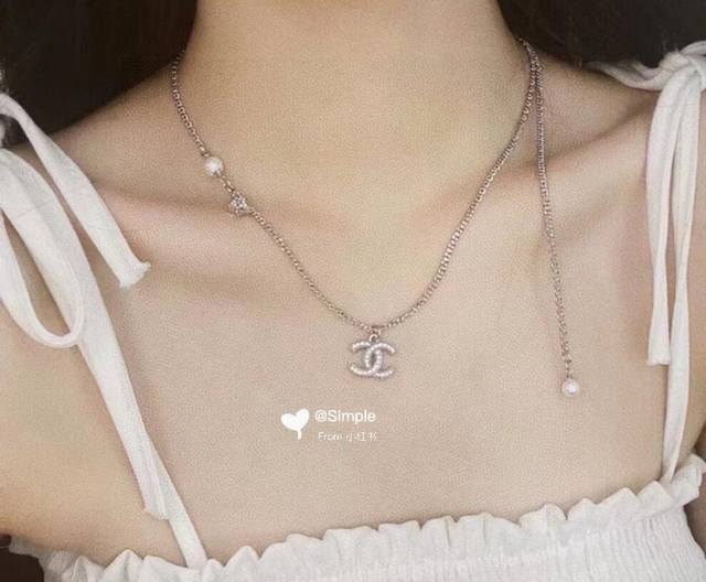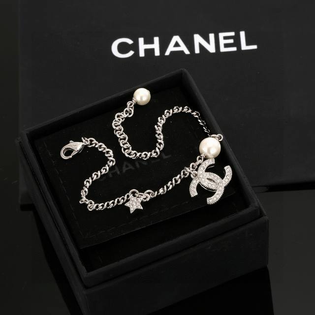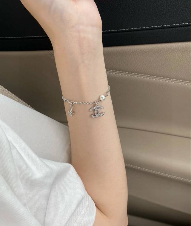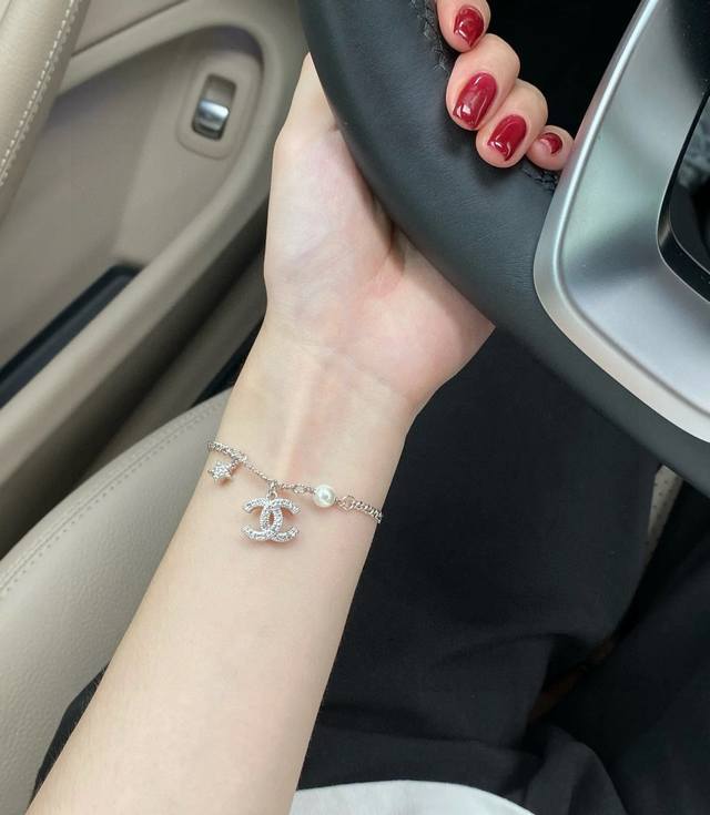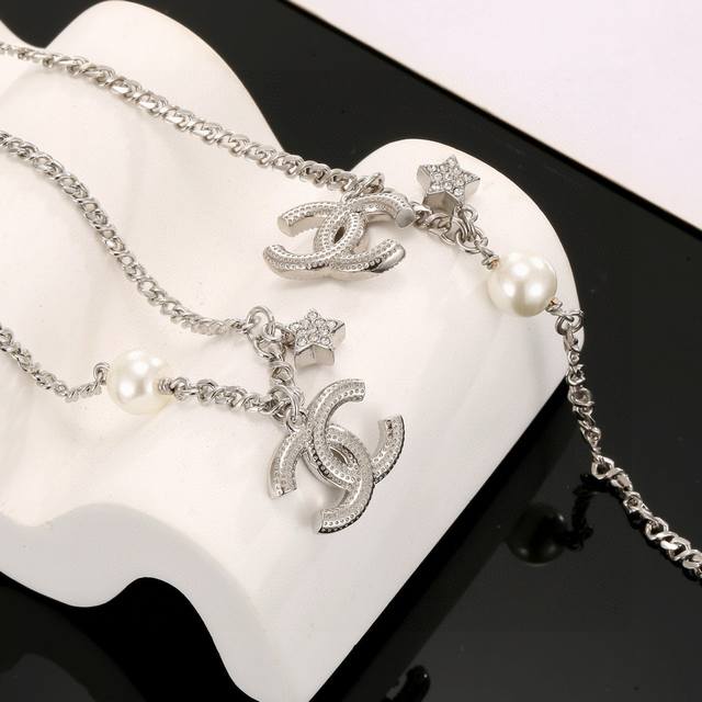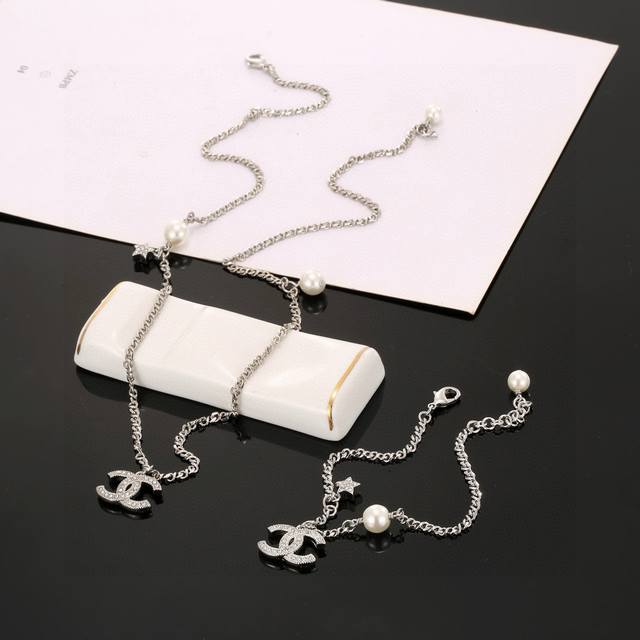 Chanel necklace and bracelet, high-end quality, same materials as boutique items, exquisite and delicate workmanship, heavy-duty version, very stylish, simple, elegant, and particularly gentle. The classic double C is adorned with Swarovski crystals, super sparkly and luxurious. Below is a round pendant with three-dimensional pearls, softening the boldness and adding a touch of vintage gentleness. Necklace/bracelet 50