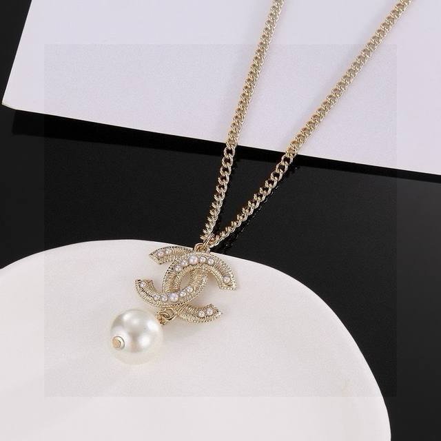 Chanel necklace and earrings, high-end quality, same materials as in boutiques, exquisite and delicate workmanship, heavy-duty version, very stylish, simple, elegant, and particularly gentle. The classic double C is adorned with Swarovski crystals, super sparkly and luxurious. Below is a round pendant with three-dimensional pearls, softening the boldness and adding a touch of vintage gentleness. Necklace and earrings 50