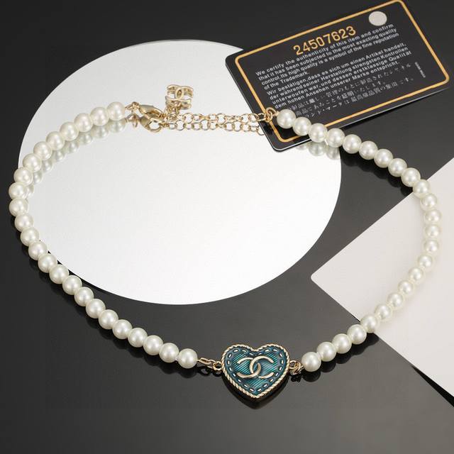 Chanel New Double C Heart Peach Vintage Blue Pearl Bracelet and Necklace. This versatile and stylish piece is easy to match with any outfit. It's a flattering everyday style that flatters the face and exudes elegance and sophistication. (Necklace/Bracelet -