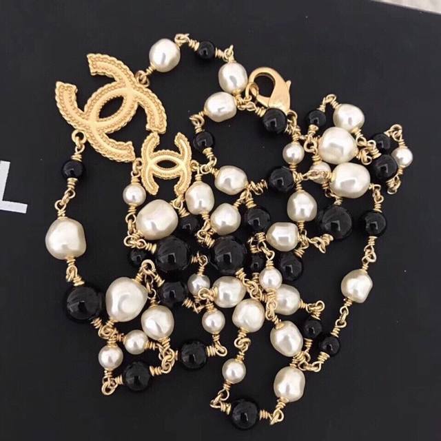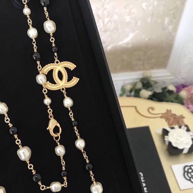 Chanel wheat ear black and white pearl sweater chain! A simple design featuring two gold double C pearls, one large and one small! It looks great worn as a long chain, double loop, or short chain! Note that this is an authentic product without a tail chain; versions on the market with a tail chain are incorrect! Purely handmade, high-end custom-made.