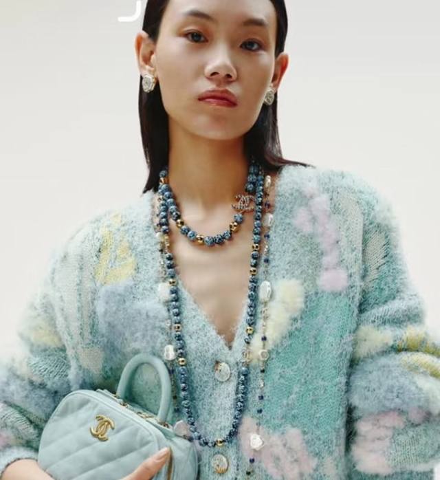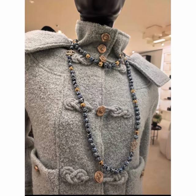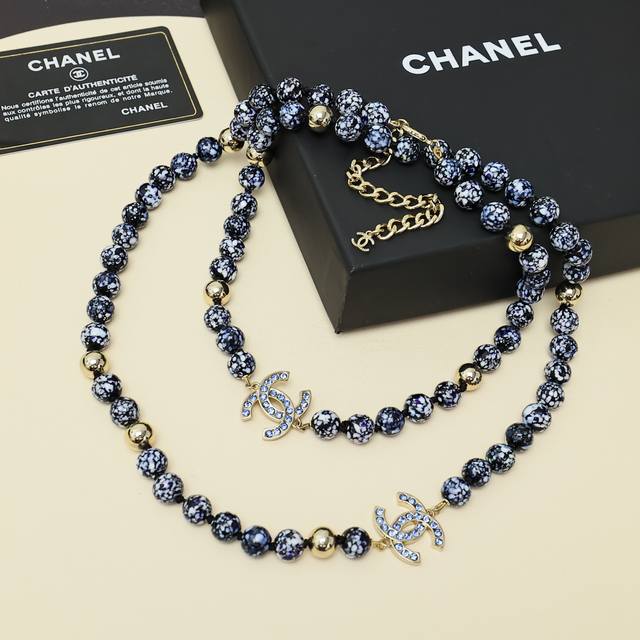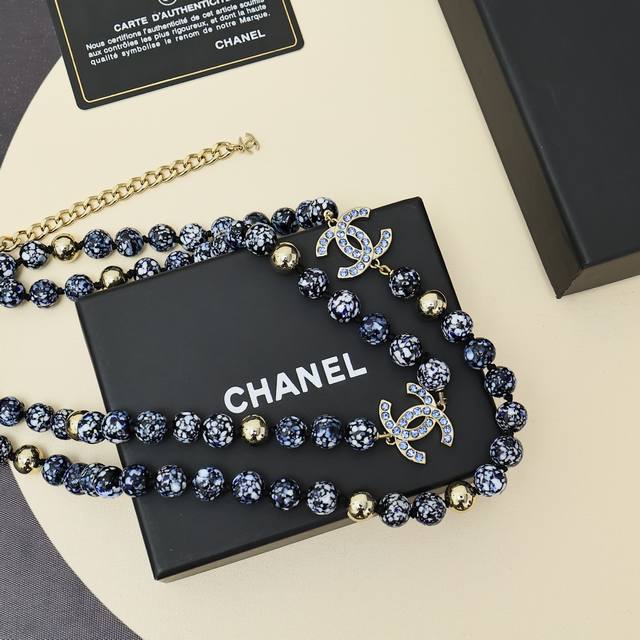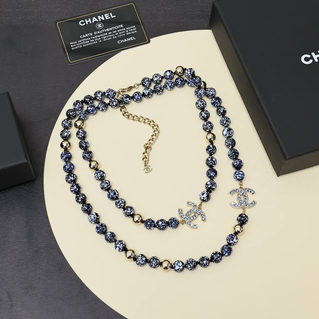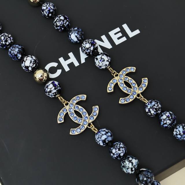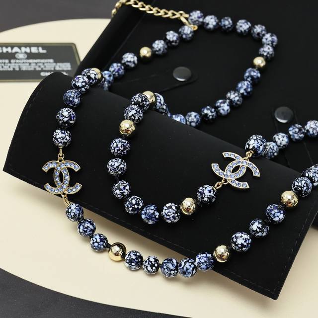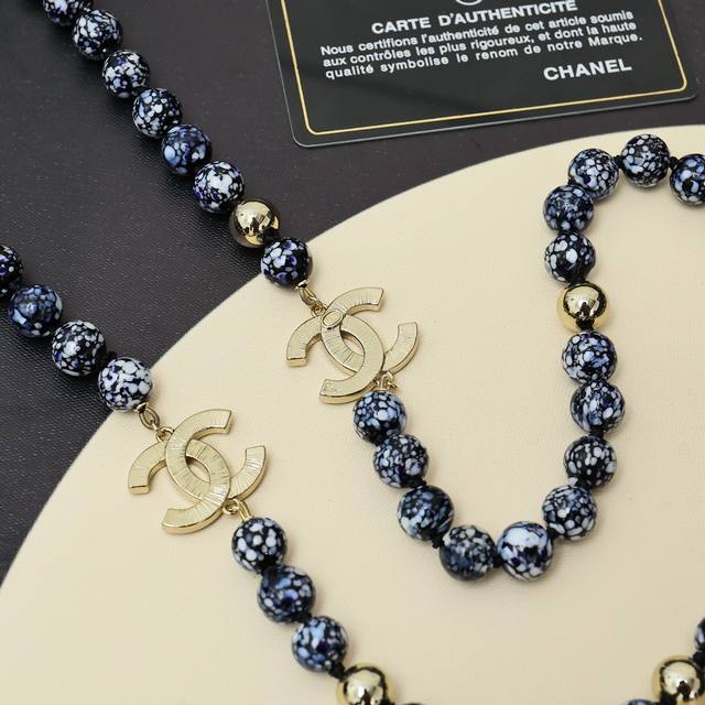 Chanel25A Double C Blue and White Porcelain Glass Beads Sweater Chain