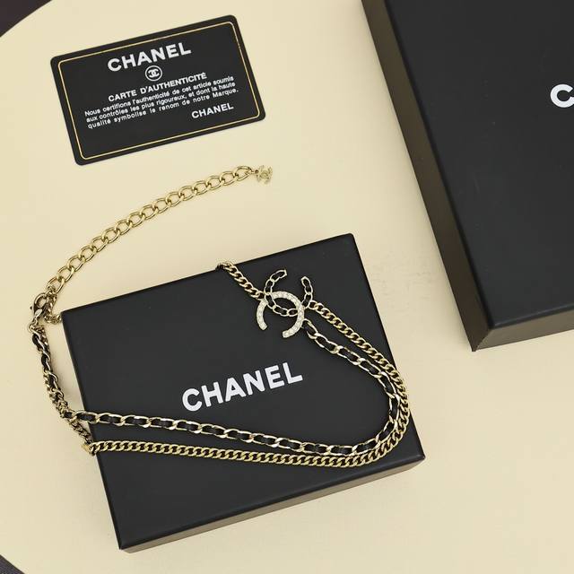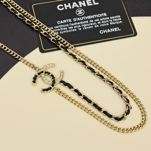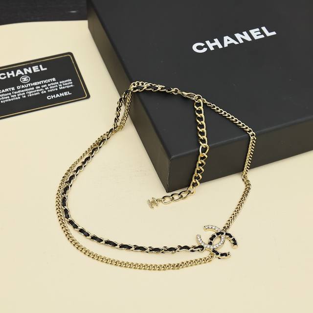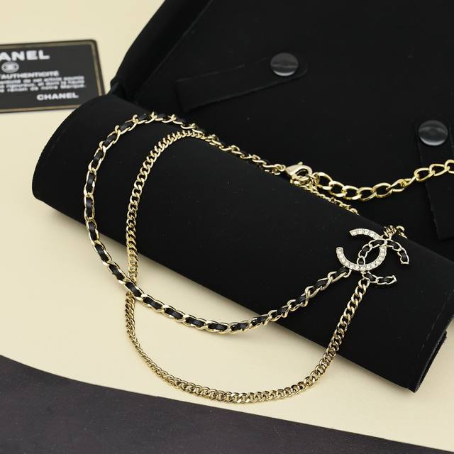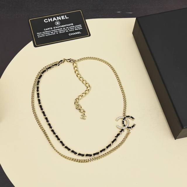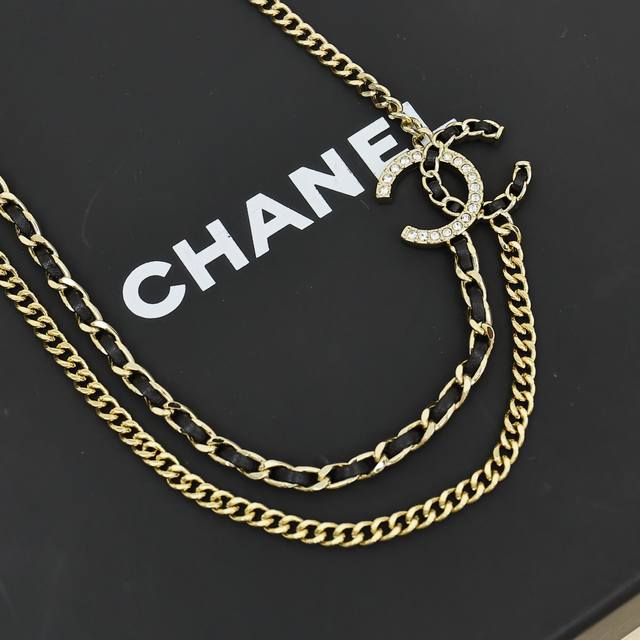Chanel25B classic leather with rhinestone stitching double C double chain necklace