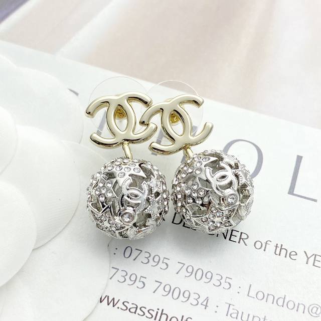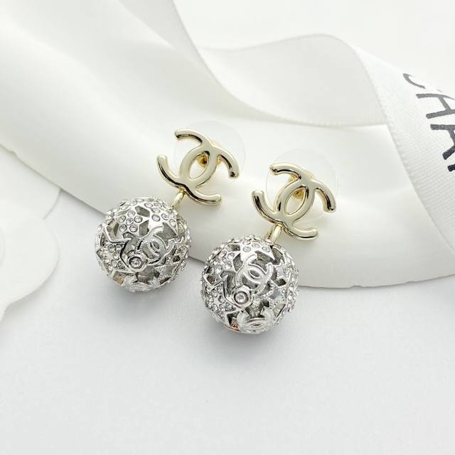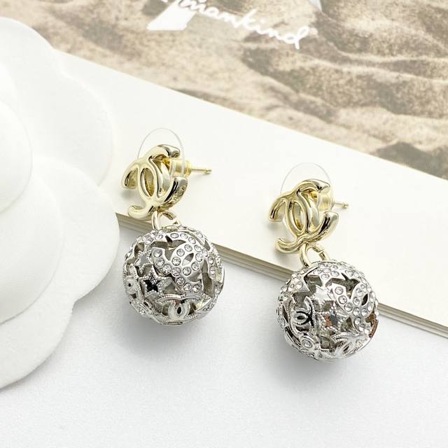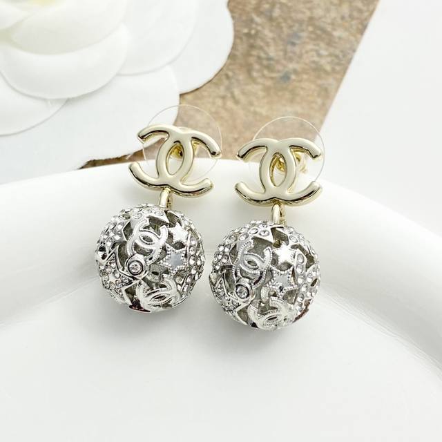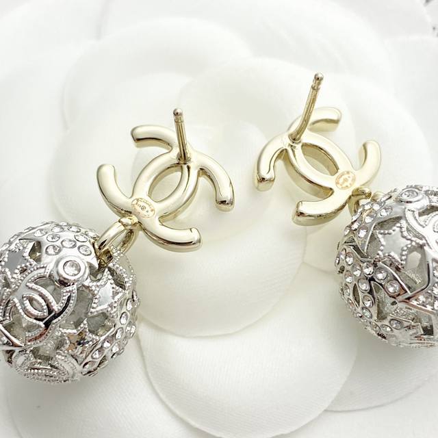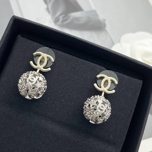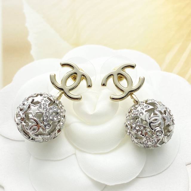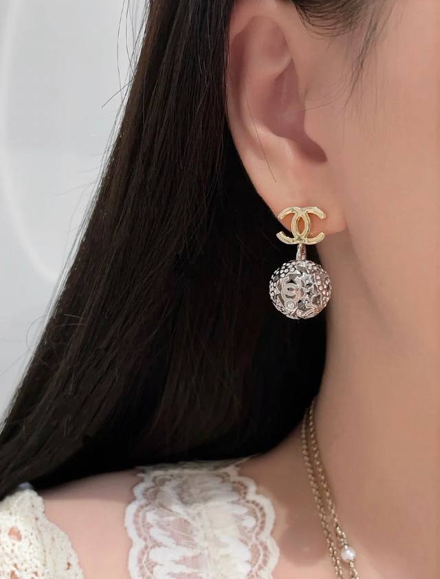 Chanel's best-selling earrings are now available! Chan 25 Hollow Ball Double C Earrings. The light gold finish double C pendant features a sparkling hollow planet. The diamond balls are blingbling and very textured, and full of elements. The gold and silver color combination makes it even more eye-catching and bright, beautiful and elegant.
