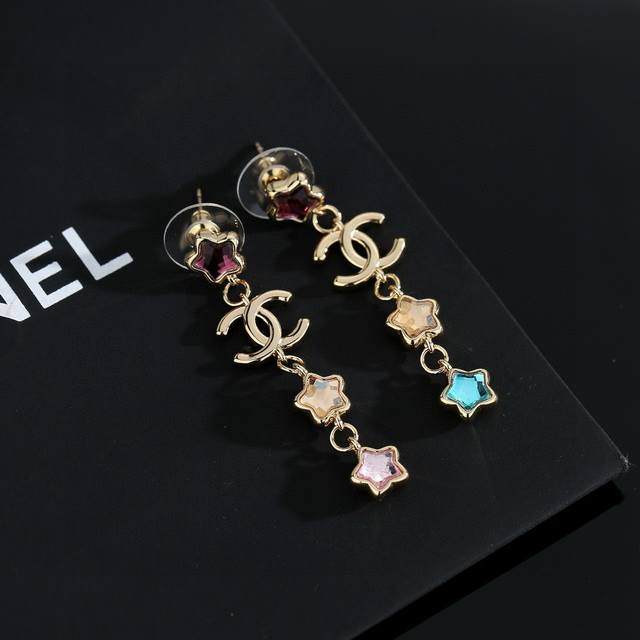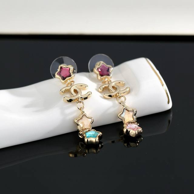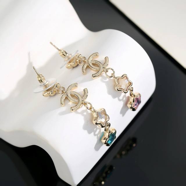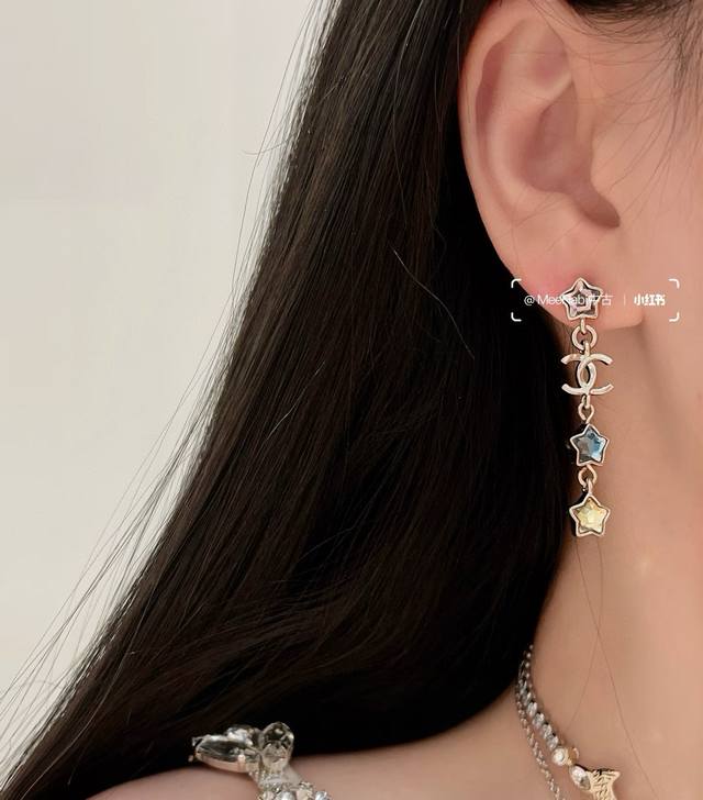 Chanel's new star-patterned long stud earrings flatter the face. The gold metal trim adds a touch of mystery, sophistication, and vintage charm. The double-C metal logo in resin is a classic and versatile color-blocked design! (Earrings available from