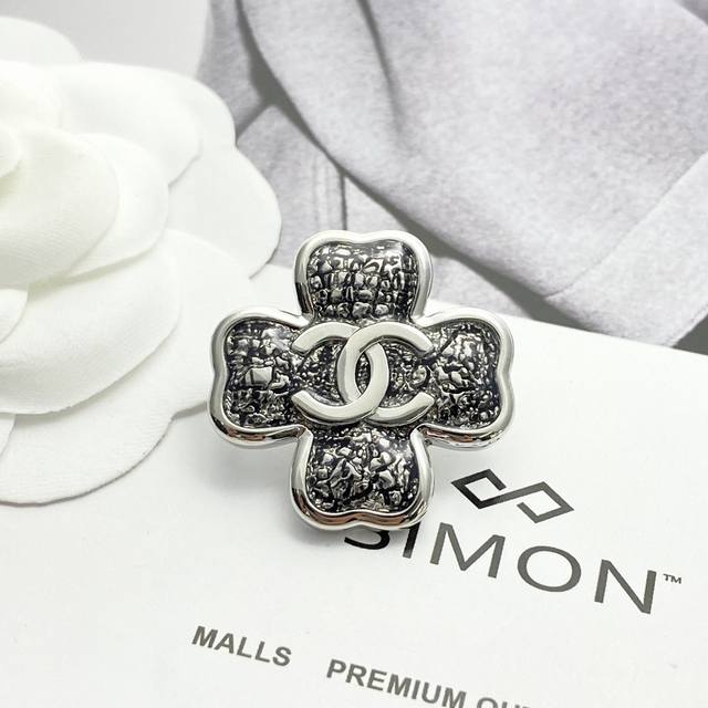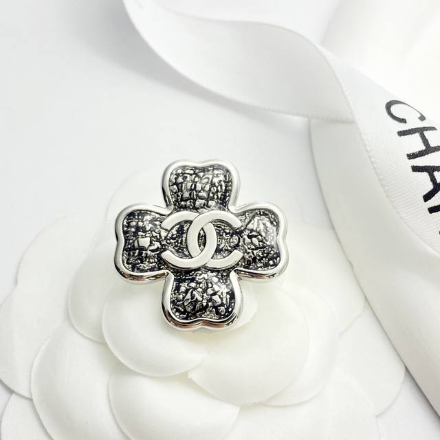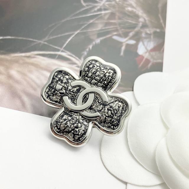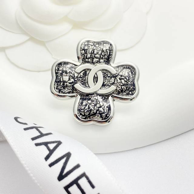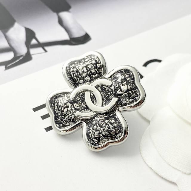 Chanel 25 Black and Silver Lace Four-Leaf Clover Brooch