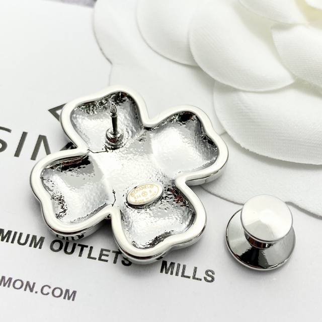 The four-leaf clover design features a shimmering lace base with silver glitter, encased in a silver metal casing