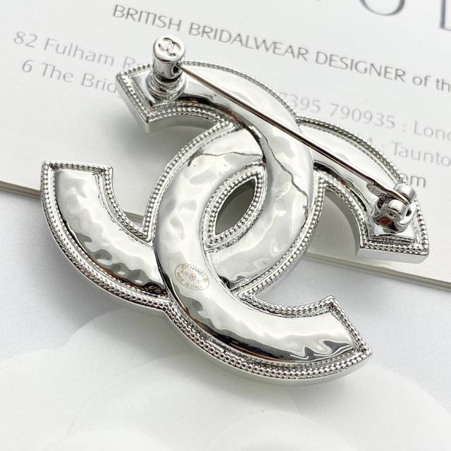 The silky white and lustrous enamel double C has a distressed silver edge design and a polished, undulating back
