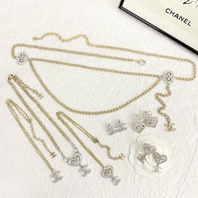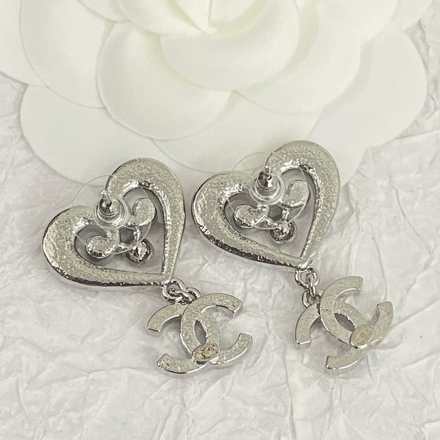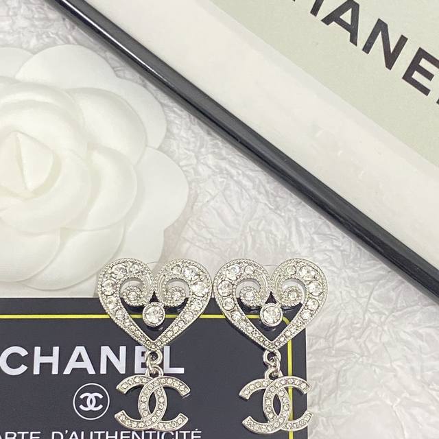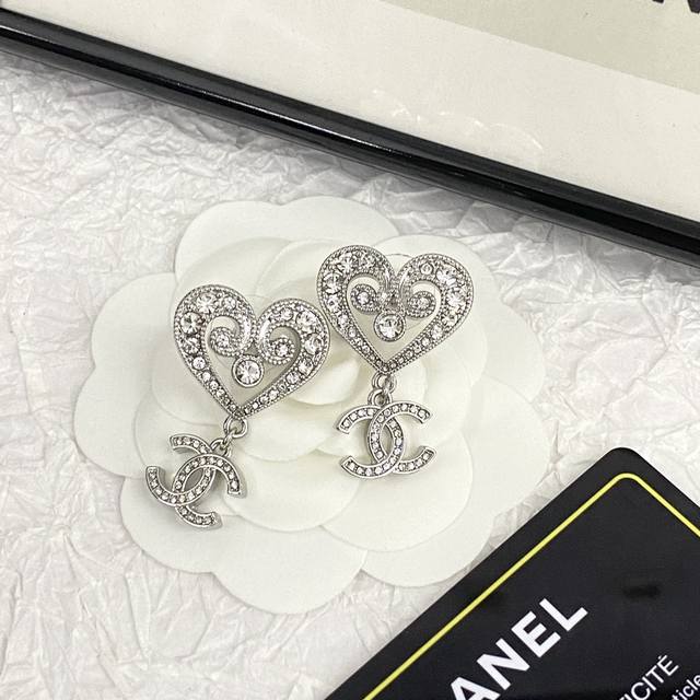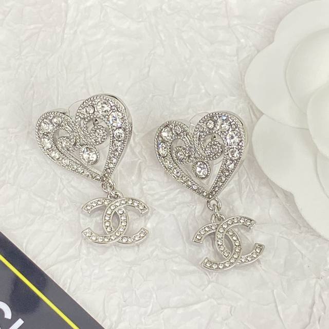 Chanel's hot-selling earrings are now available. These Chanel 23 white gold hollow crystal heart earrings are embellished with Swarovski crystals, sparkling and shimmering. Small and delicate, they are as beautiful as flowers, shimmering against a white background and showcasing their unique charm. This sweet, royal style is both youthful and versatile.