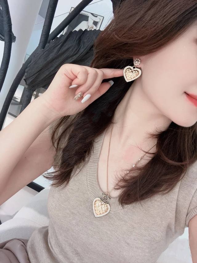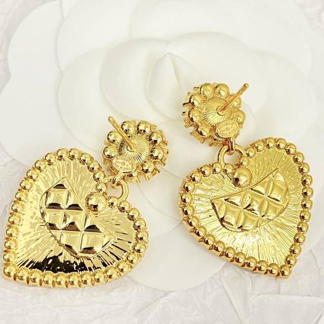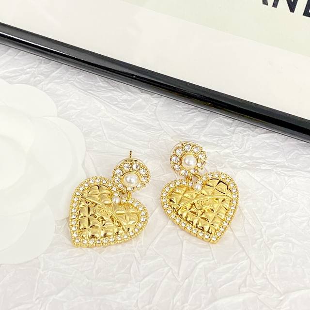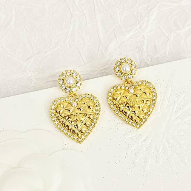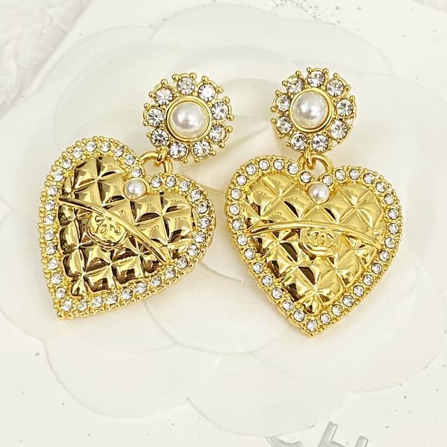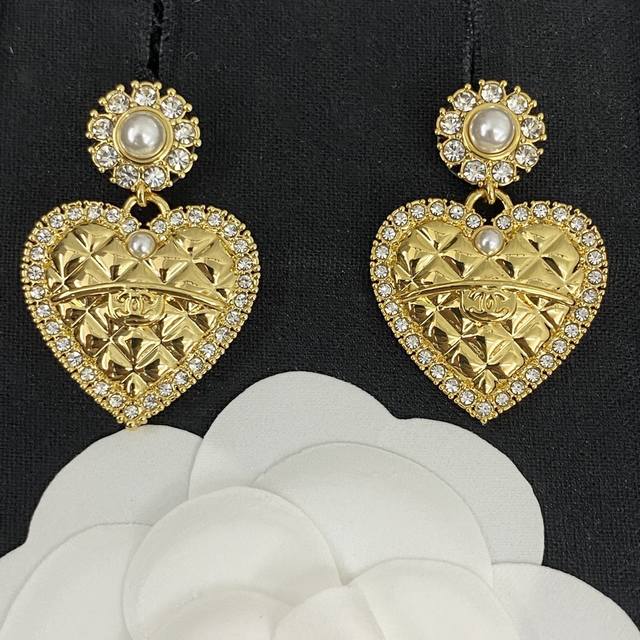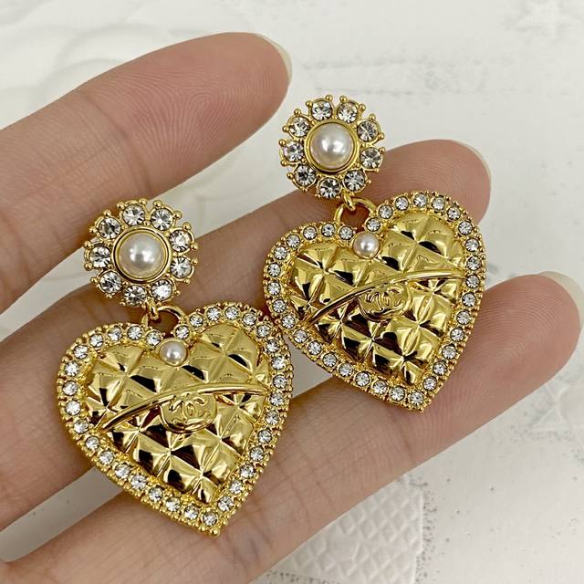 Chanel's hot-selling earrings are now available. These Chanel 24 Pearl Flower and Diamond Heart Stud Earrings are crafted from gold metal, featuring a classic heart shape and adorned with Swarovski crystals. These earrings are embellished with a royal touch! Embellished with the brand's signature elements, they boast a simple yet unique design. They exude sophistication and a refined, effortlessly elegant feel.