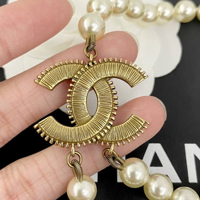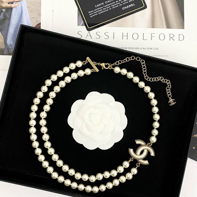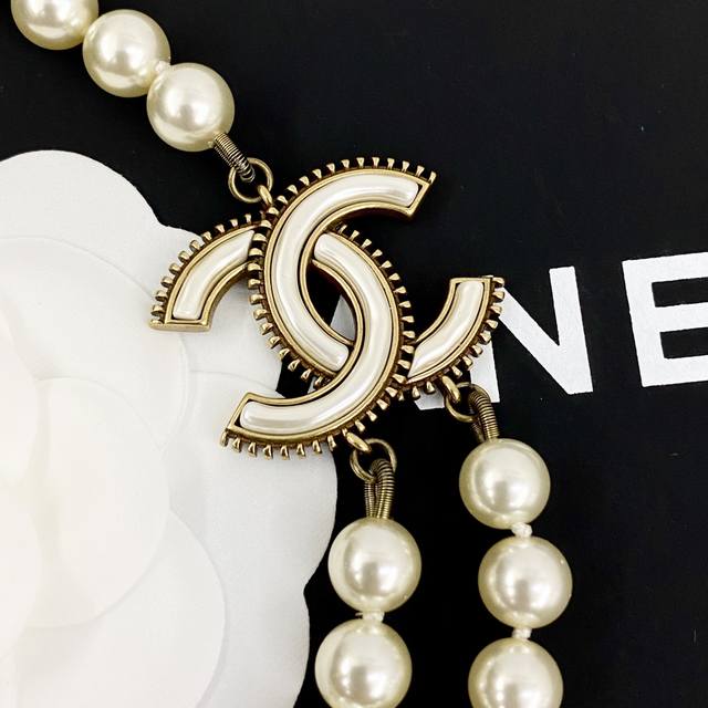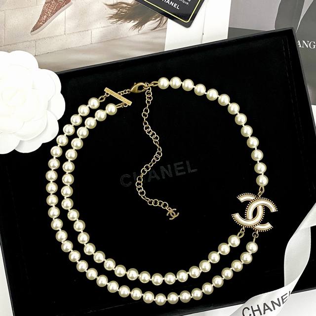 Chanel 25 Vintage Gold Double C Mother-of-Pearl Zipper Double Layer Pearl Necklace