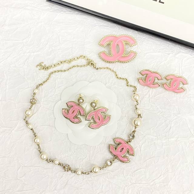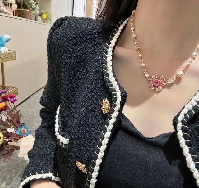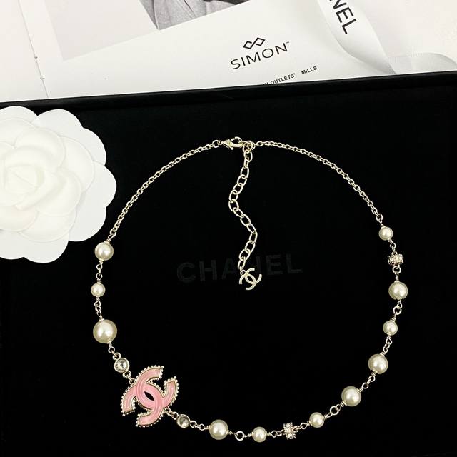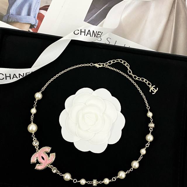 Pink gold pearl glass resin double C, uniquely using a combined chain as the main body, perfectly combining elegance and girlish charm.