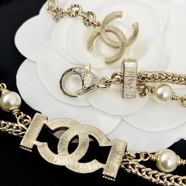 The classic full-diamond double C logo hangs in the center. The snake bone and pearls are both sweet and cool!