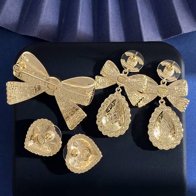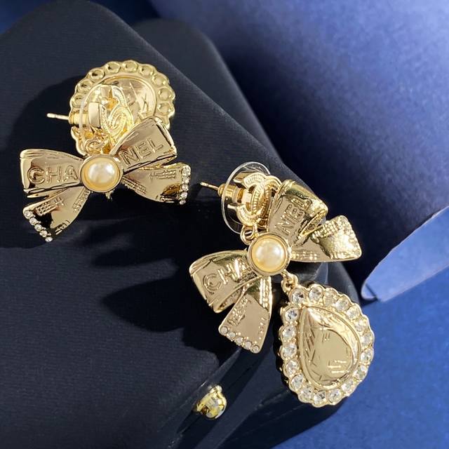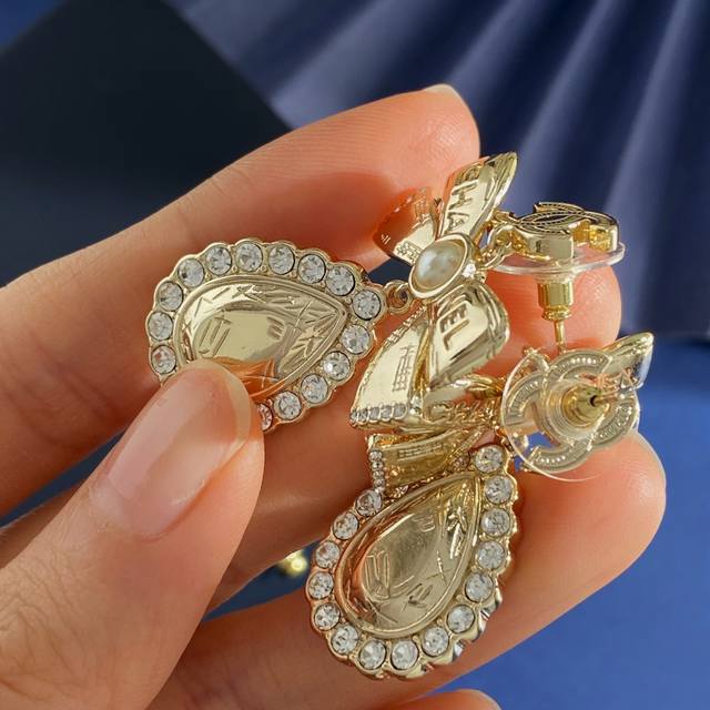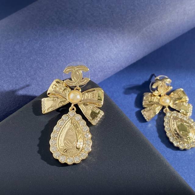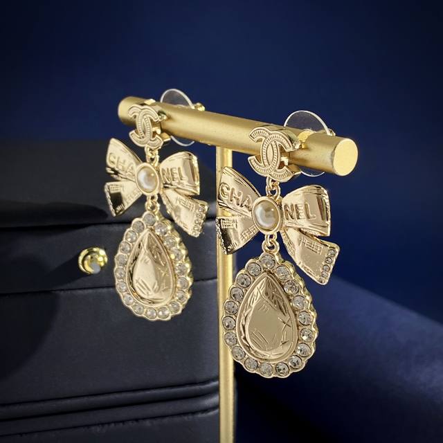 Chanel style, European and American fashion, high-end feel, small double C letter pendant, pearl bow, rhinestone embellishment, teardrop shape, long stud earrings, brass material, dimensions approximately 4.4cm long * 1cm top width * 2.8cm middle width * 1.8cm bottom width * 0.2cm thickness