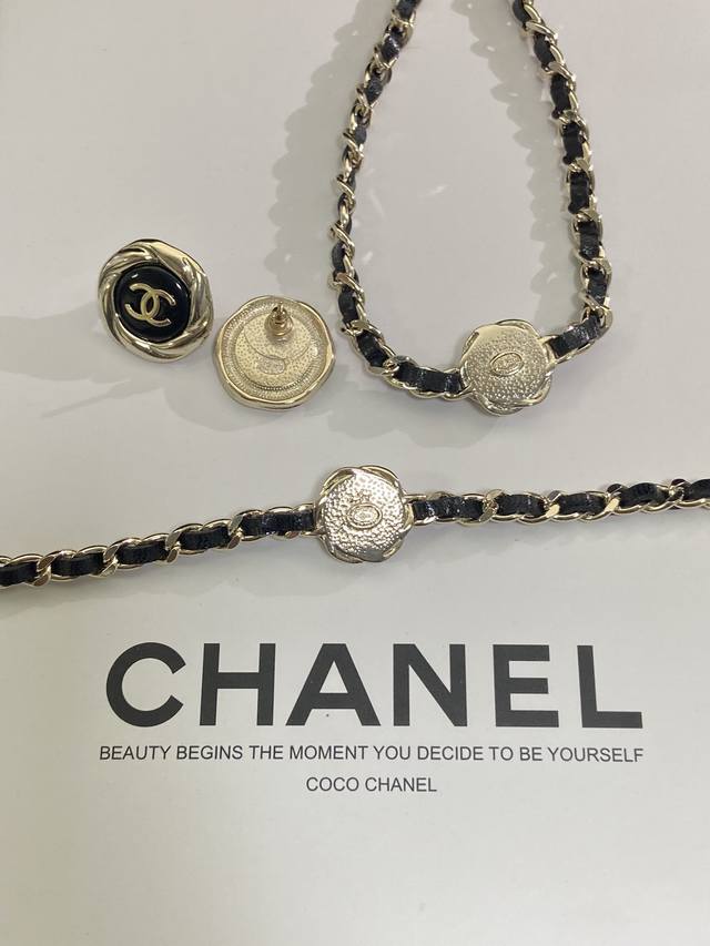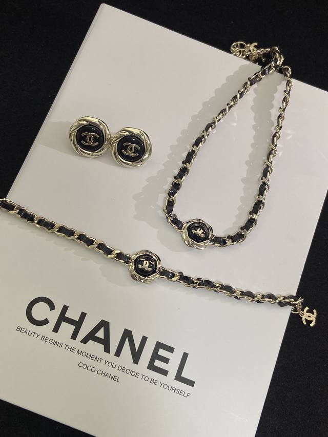 / Necklace, Earrings, Bracelet Chanel Black and Gold Double C Button Set Looks goo