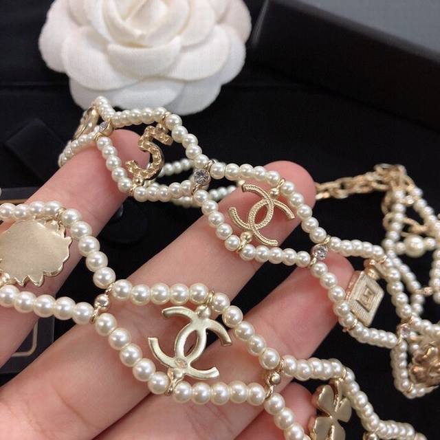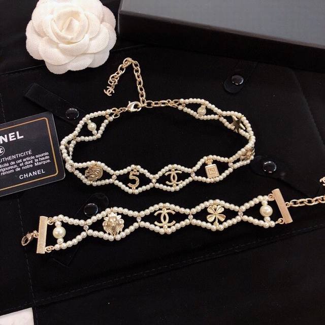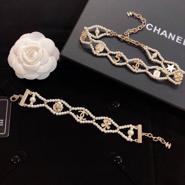 Necklaces and bracelets by Ch*Nel. A stylish Chanel Chocker. New Chanel pearl necklace. Pearls create a sense of elegance and nobility. Exclusively authentic and custom-made, brass Swarovski pearls are crafted from premium brass. Each necklace is handwoven, revealing its preciousness.