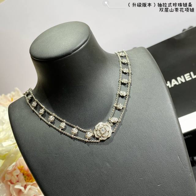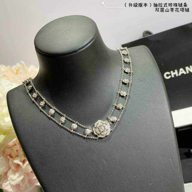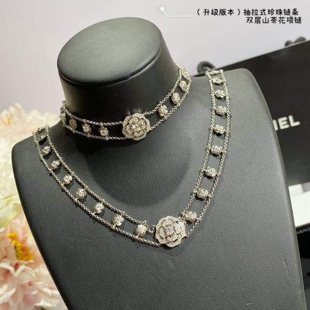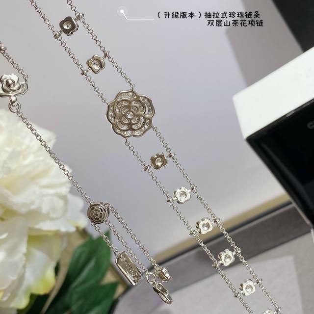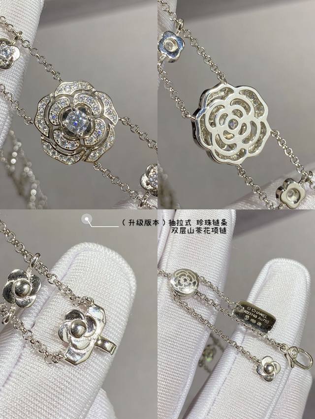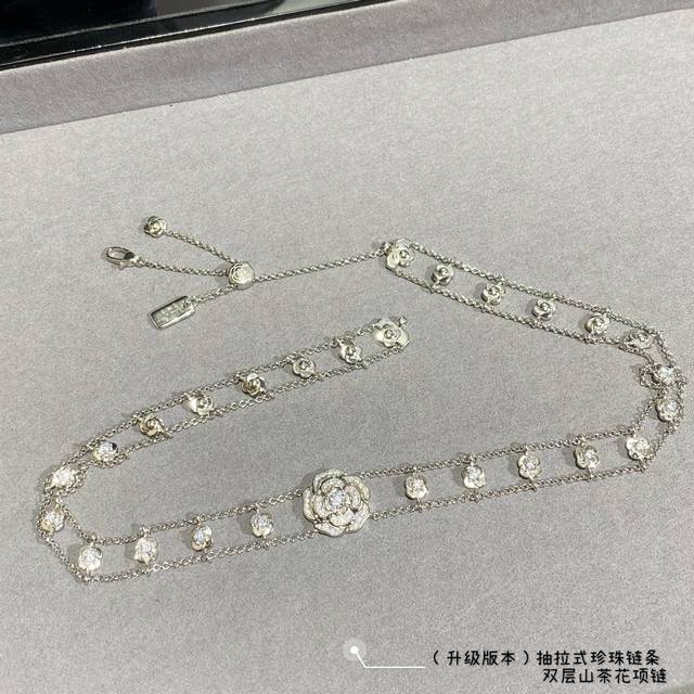 New version, a V-neck Chanel double-layer camellia necklace with a retractable pearl chain at the back. What woman can resist this charm? Layering is incredibly difficult to produce! Even a skilled craftsman can't make many flowers in a day. The three-dimensional, vivid blooms are perfectly formed. Embellishing the look, every gesture exudes a confident and soft charm, perfectly embodying youthful vitality and elegant fashion.