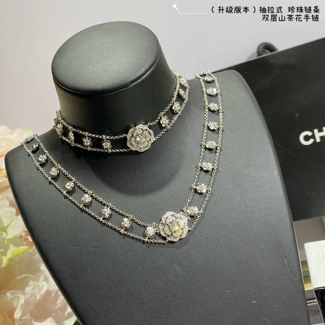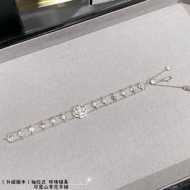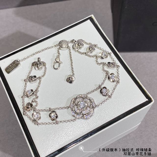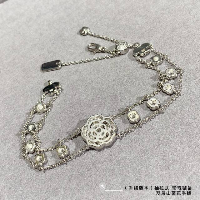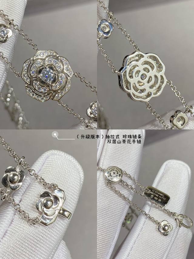 New version, this Chanel Camellia double-layer bracelet in V-gold with a retractable pearl chain at the back. What woman can resist this charm? Layering is incredibly difficult to produce! Even a skilled craftsman can't make many flowers in a day. The three-dimensional, vivid blooms are perfectly formed. Embellishing the look, every gesture exudes a confident and soft charm, perfectly embodying youthful vitality and elegant fashion.